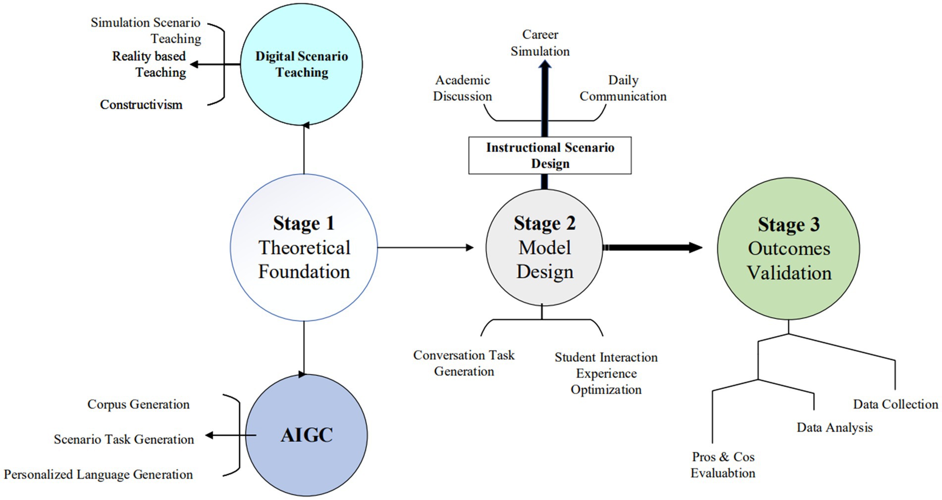 Figure 2 outlines a three-stage process for developing and validating a digital scenario teaching model with the help of Artificial Intelligence Generated Content (AIGC). Stage 1 (Theoretical Foundation) integrates digital scenario teaching principles, such as constructivism, simulation, and reality-based teaching, while leveraging AIGC for generating personalized language tasks and scenarios. In Stage 2 (Model Design), the instructional scenario is designed for various contexts (career simulation, academic discussion, daily communication), focusing on generating conversation tasks and optimizing student interaction. Stage 3 (Outcomes Validation) involves evaluating the designed model through data collection, analysis, and assessing its pros and cons. The flow shows how theoretical concepts and AI capabilities combine to create and validate effective digital teaching scenarios.