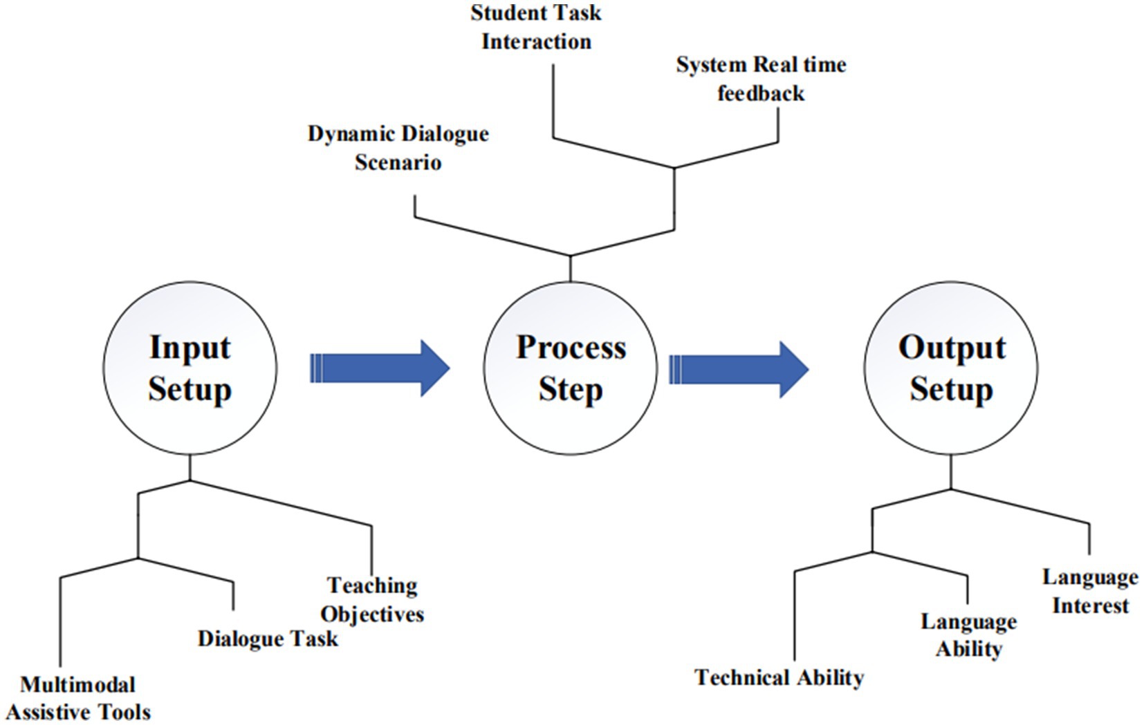 Figure 3 illustrates the process of language learning with multimodal assistive tools: beginning with input setup (teaching objectives, dialogue tasks), progressing through dynamic student interaction and system feedback, and resulting in improved technical and language abilities and increased learner interest.