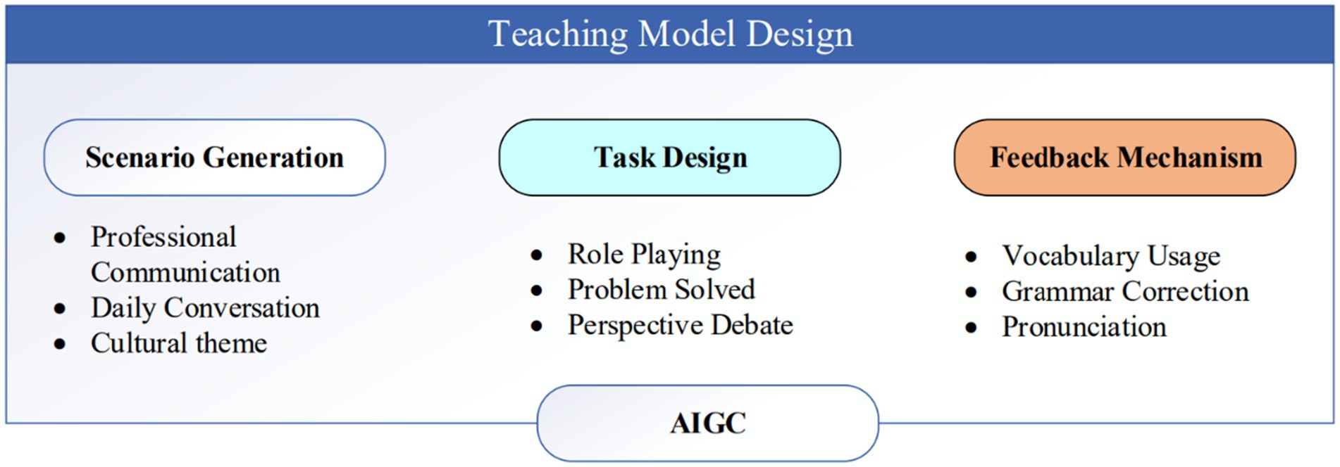 AIGC provides real -time response, analyzes the language production of students, and gives personal suggestions to improve various aspects such as vocabulary usage, grammar, and pronunciation. In addition to automated responses, teachers ‘and students ‘interactions and colleagues contribute to further strengthening the learning process, promoting a collaborative and supportive environment for improvement. This teaching model prioritizes student-centric learning by encouraging active participation through dynamic scenarios and functioning activities. The ultimate goal is to enhance the communication capacity of students, enriching their overall learning experience, ensuring that both language skills and engagement are maximized.