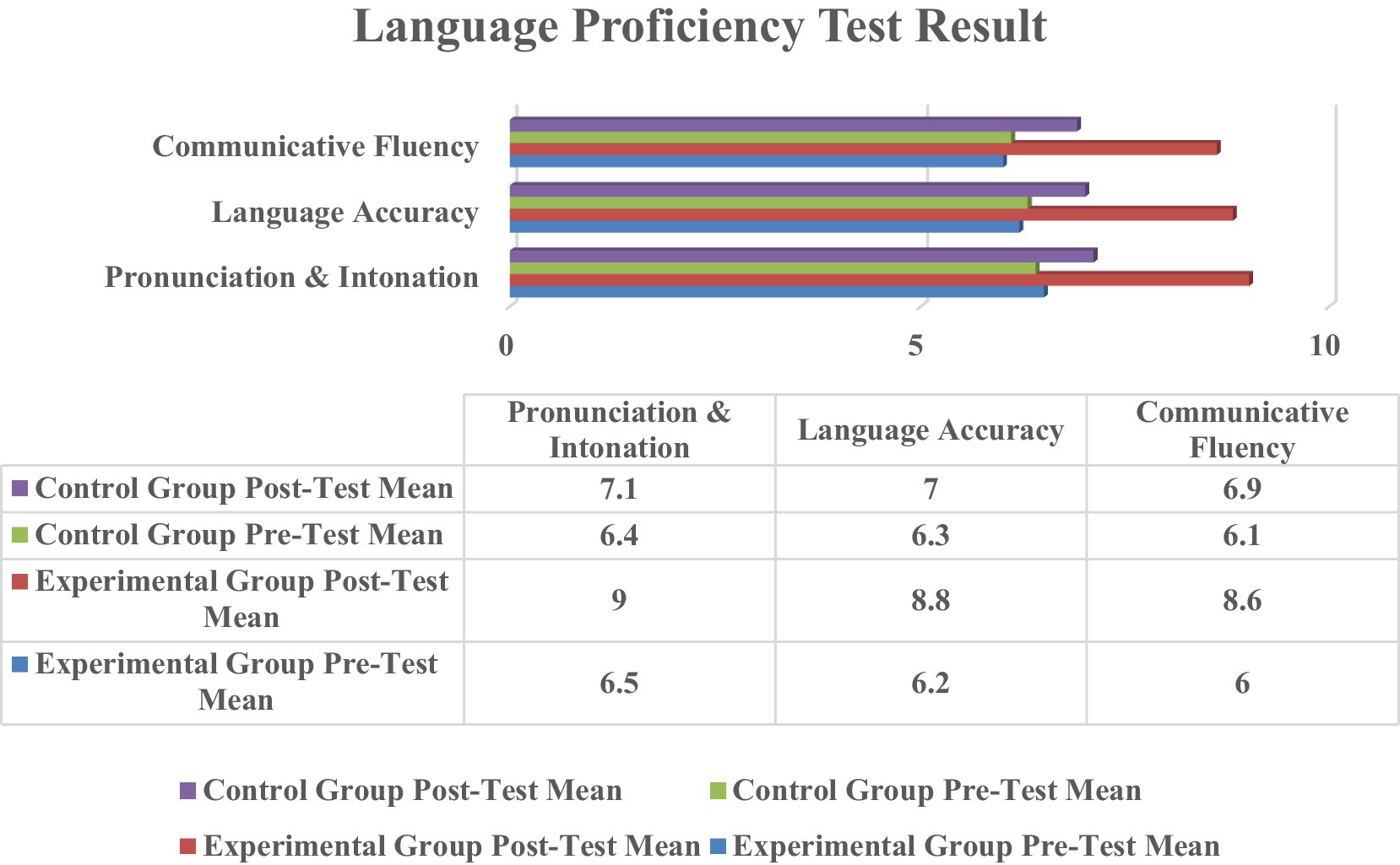 Comparison between pre-testing and subsequent results of testing reflects adequate progress in the language proficiency of the experimental group in all assessed areas (Figure 5).