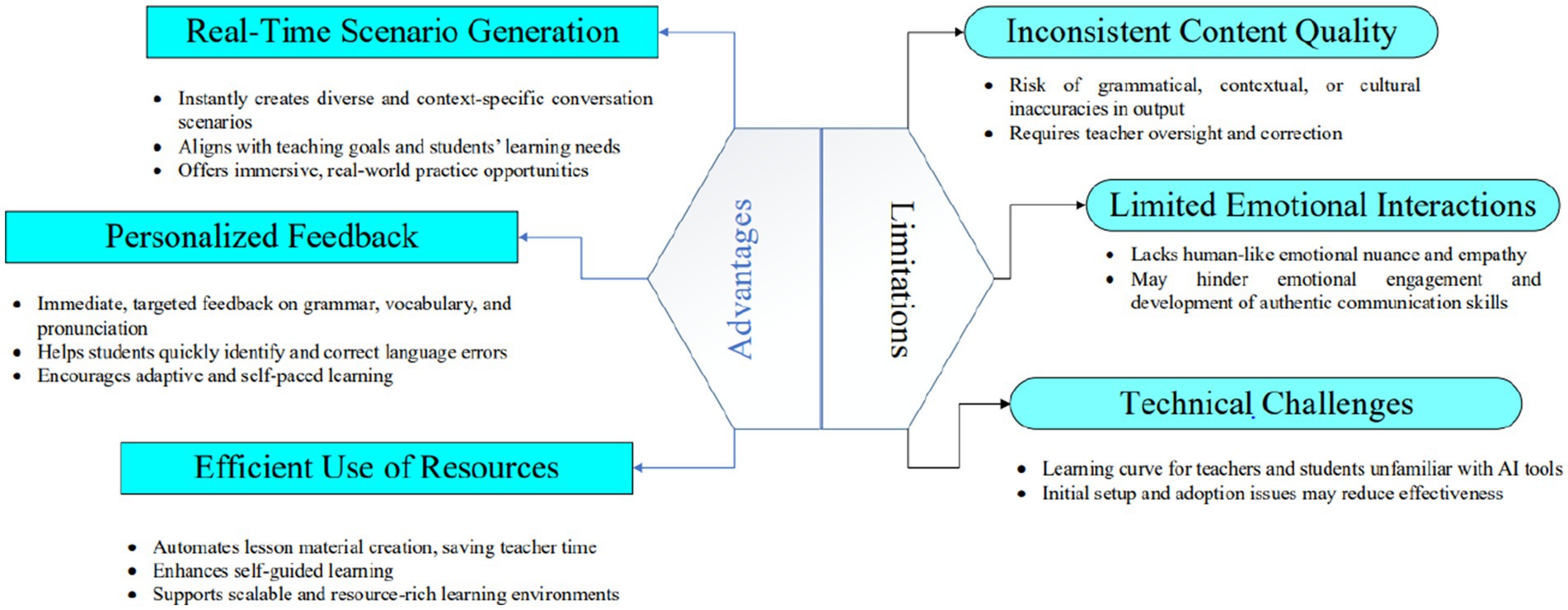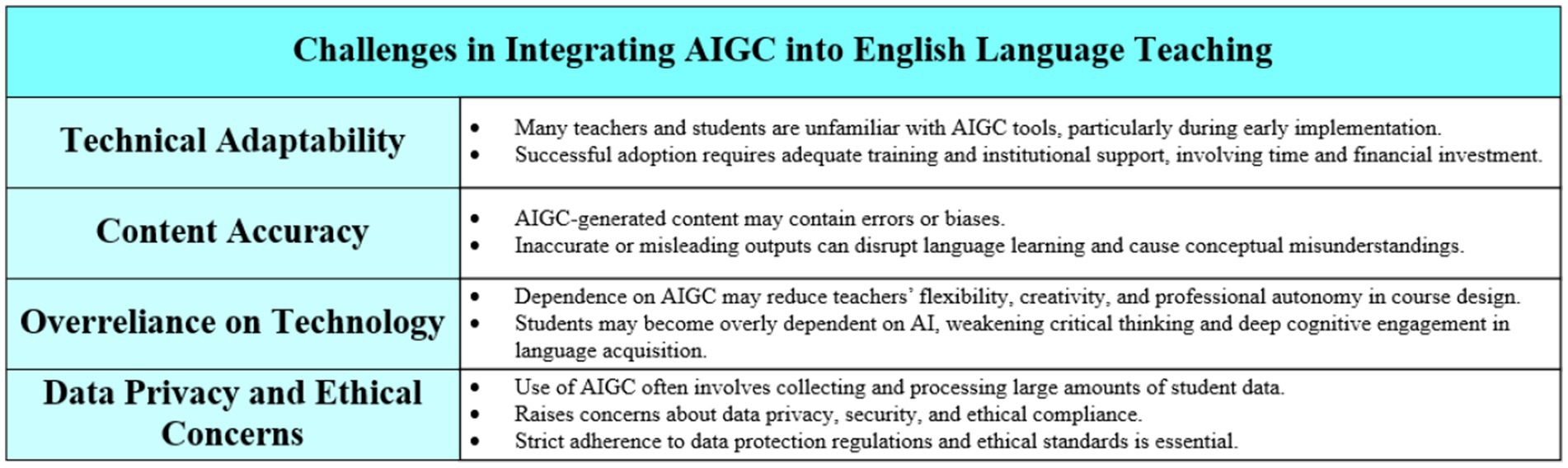 • Overreliance on Technology: Overreliance on AIGC may have harmful effects on the teacher’s flexibility in course design, which reduces their creativity and ability to use their expertise. Moreover, the student may also become highly dependent on the technology and disengaged by deep cognitive processes that involve language acquisition.