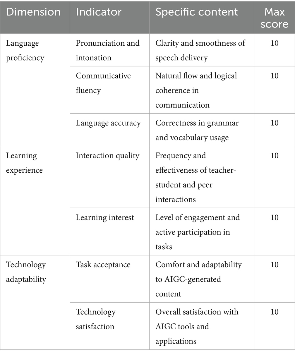 To strictly evaluate the success of the AIGC-based digital scenario teaching model, a comprehensive assessment structure was designed, which included three major dimensions: language proficiency, learning experience, and technical adaptability. Each dimension is evaluated through specific indicators, as mentioned in Table 1. Each dimension is designed to assess a separate aspect of the teaching process, which ensures students’ language skills, engagement, and a well-round evaluation of the effectiveness of the AIGC-based model in increasing the ability to adapt to technological innovation.