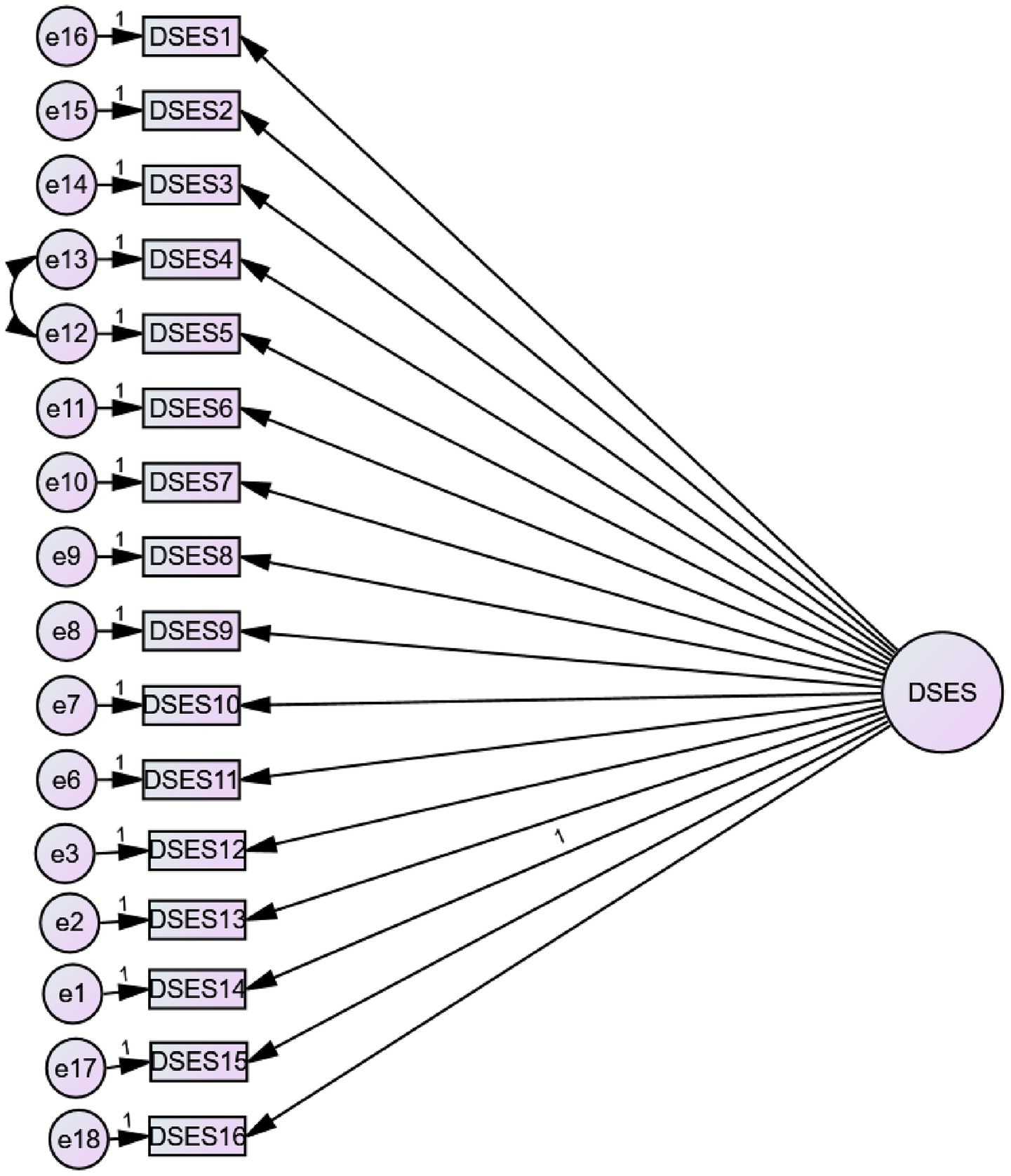Reliability and construct validity of this scale from the analysis, an initial confirmatory factor analysis (CFA) performed on the Daily Spiritual Experience Scale (DSES) showed a less-than-fair model fit for the data given the poor CFI and RMSEA values, χ2 (104) = 533.53, p < 0.001; CFI = 0.86, RMSEA = 0.10 [90% CI = (0.09, 0.11)], and SRMR = 0.06. Modification indices (MI) suggested covarying the error terms of items 4 (“I find strength in my religion or spirituality”) and 5 (“I find comfort in my religion or spirituality”). After the covariation, an acceptable model fit was obtained for the DSES scores, χ2 (103) = 390.11, p < 0.001; CFI = 0.91, RMSEA = 0.08 [90% CI = (0.07, 0.09)] and SRMR = 0.06. Figure 1 presents the CFA for the DSES with standardized loadings.