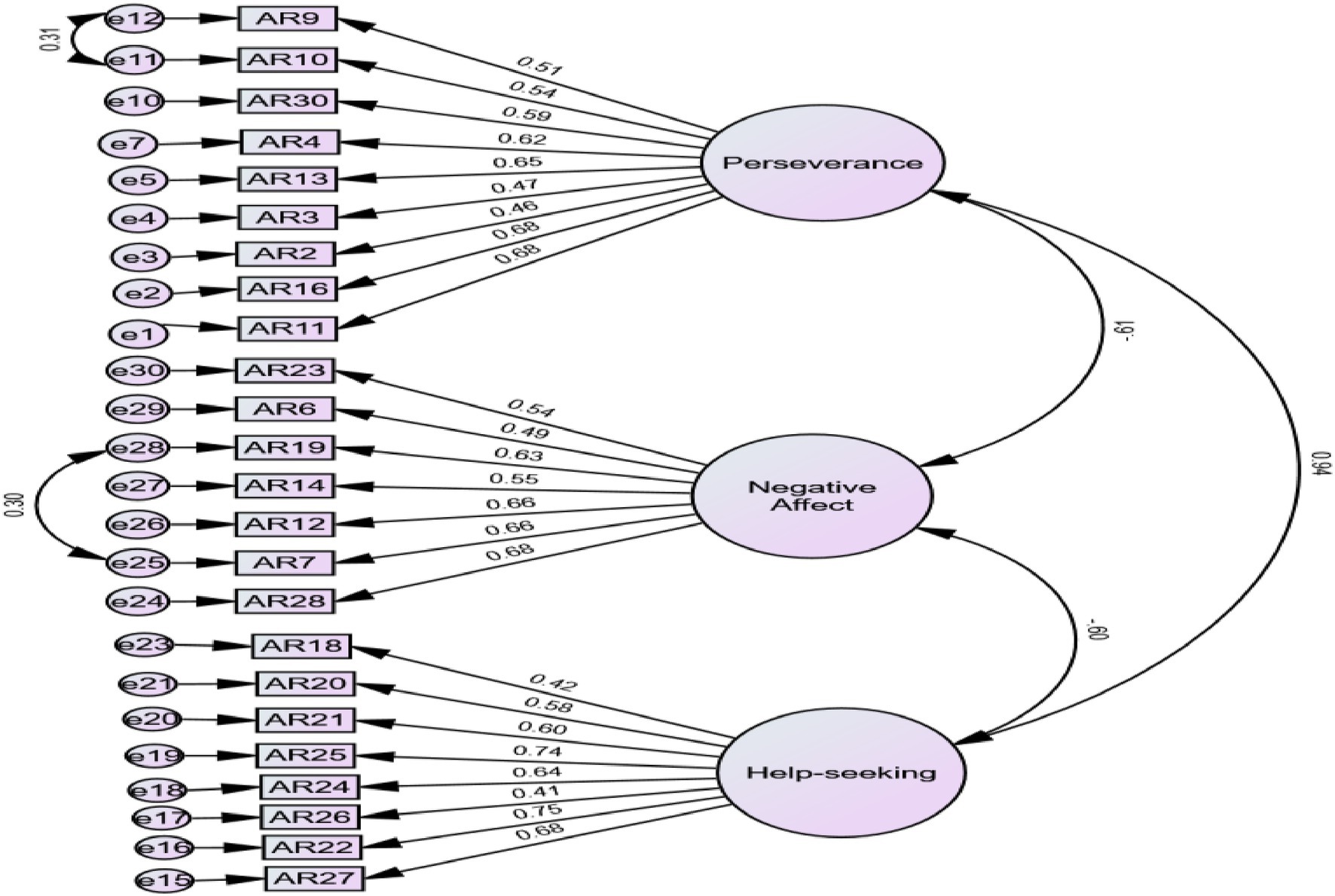 From the analysis on reliability and construct validity of this scale, the initial CFA for the ARS-30 subscales showed a poor model fit: χ2 (402) = 1,052.97, p < 0.001; CFI = 0.83; RMSEA = 0.06 (90% CI: 0.06–0.07); SRMR = 0.07. Items with low standardized loadings (0.09–0.38) were removed from further analysis: items 8, 1, 5, 17, and 15 (perseverance subscale) and item 29 (help-seeking). Additionally, error terms were covaried for items 9 and 10 (perseverance), and items 7 and 19 (negative affect). These modifications improved model fit to acceptable levels: χ2 (247) = 578.22, p < 0.001; CFI = 0.90; RMSEA = 0.057 (90% CI: 0.05–0.06); SRMR = 0.06. Figure 2 presents the final CFA model for the ARS with standardized loadings. The internal consistency coefficients of scores on study instruments. All scales and subscales have high-reliability coefficients ranging between 0.74 and 0.90, as presented in Table 1.