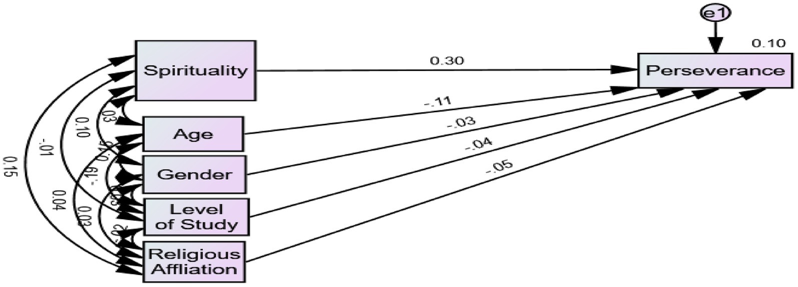 Hypothesis 1: It was hypothesized that spirituality will significantly associate positively with academic perseverance among North-West University undergraduate students. This hypothesis was examined using multiple regression analysis, with academic perseverance regressed on spirituality while controlling gender, age, level of study, and religious affiliation. The standardized path estimates are presented in Figure 3.