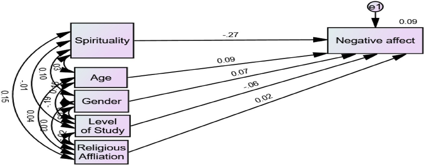 Hypothesis 2: Spirituality will significantly associate positively with negative affect and emotional response among North-West University undergraduate students. This was tested using multiple regression while controlling gender, age, level of study, and religious affiliation. Standardized estimates are shown in Figure 4.
