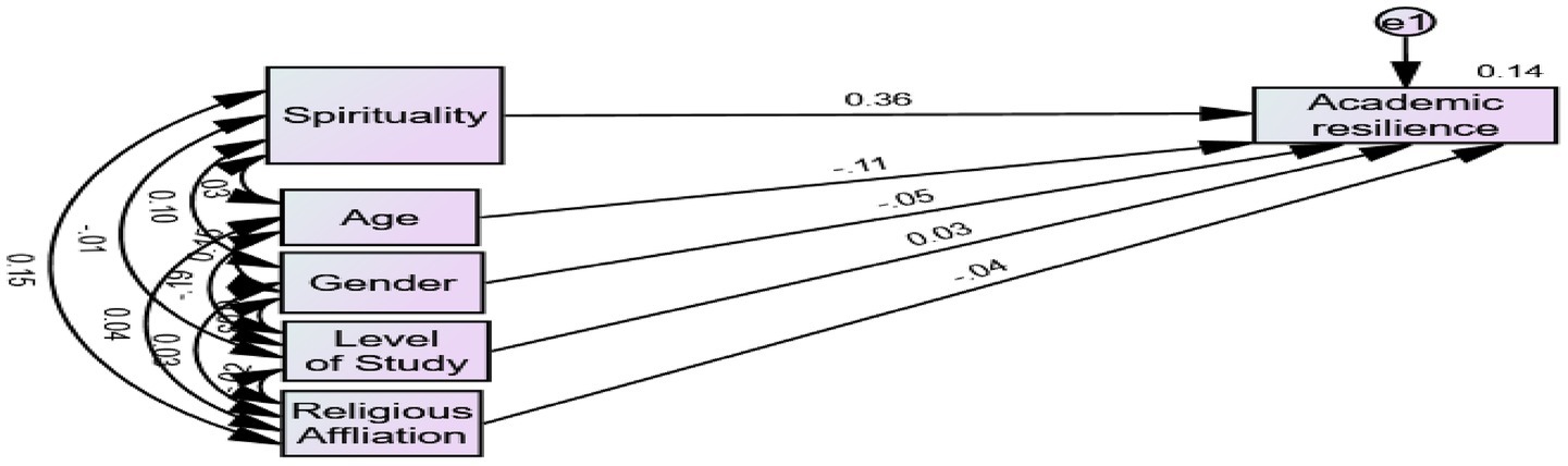 Figure 6. Spirituality predicting academic resilience while controlling for socio-demographics. The model in this figure is for the total sample.