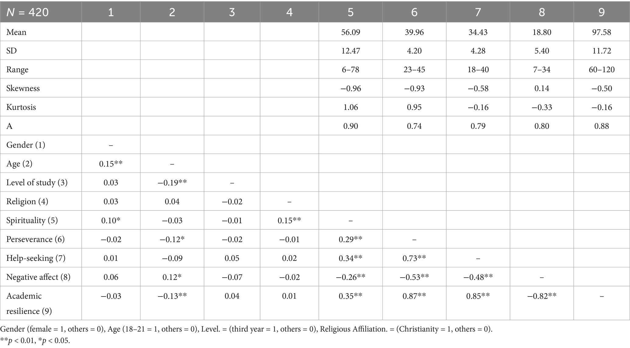 Results: The results of bivariate correlation indicated that spirituality was positively correlated with perseverance, help-seeking, and academic resilience total scores but negatively associated with negative effects. Hierarchical multiple regression analysis results also indicated a positive relationship between spirituality, academic perseverance, academic reflection, adaptive help-seeking, and academic resilience but a negative relationship with negative affect and emotional response. Furthermore, results showed a positive relationship between spirituality and academic resilience in females than in their male counterparts and a negative relationship in participants aged between 18 and 21.