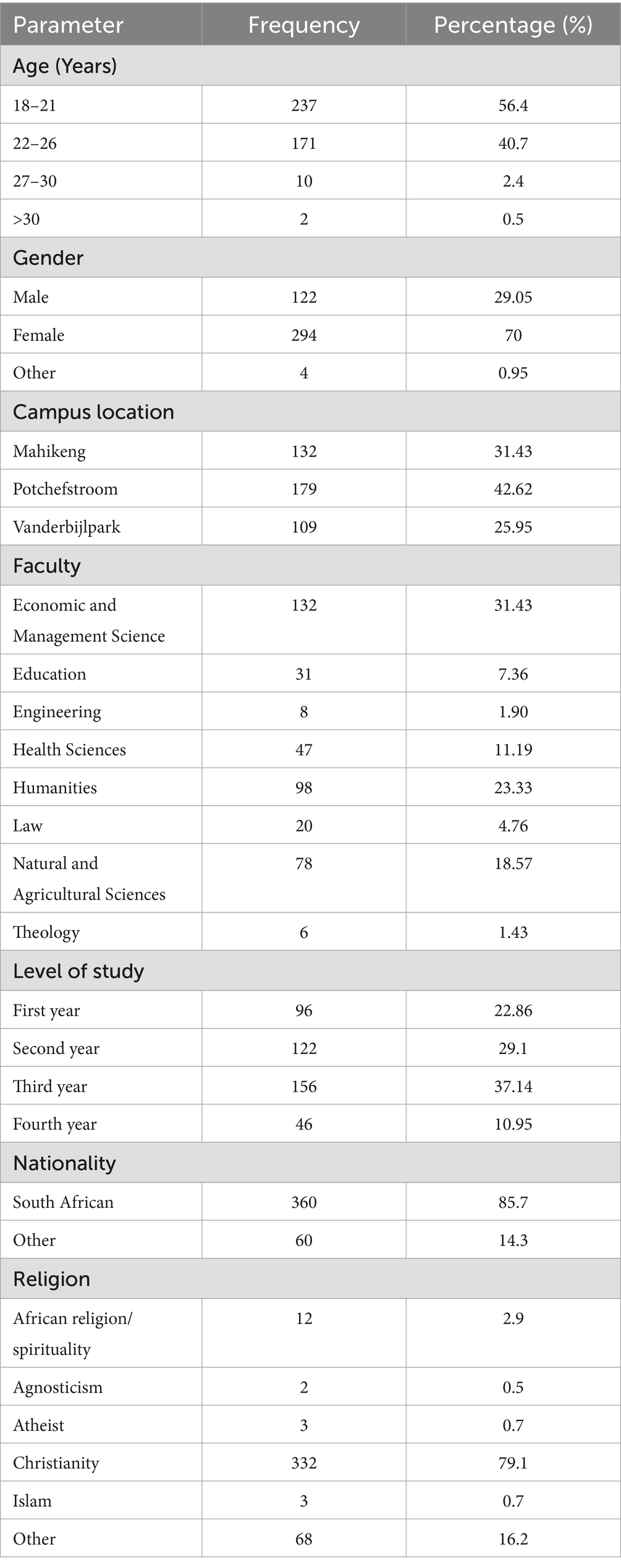 Of 39,058 undergraduate students across the NWU’s three campuses (Mahikeng, Potchefstoom, and Vanderbijilpark) as at (year the data was collected), the Yamane formular was used to arrive at 396 participants. The sample was increased to 420 to increase generalization of the findings (Borodovsky, 2022).
