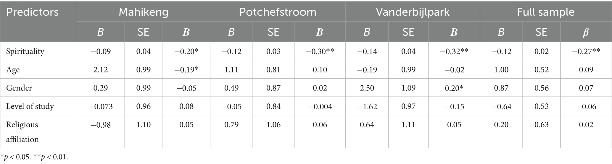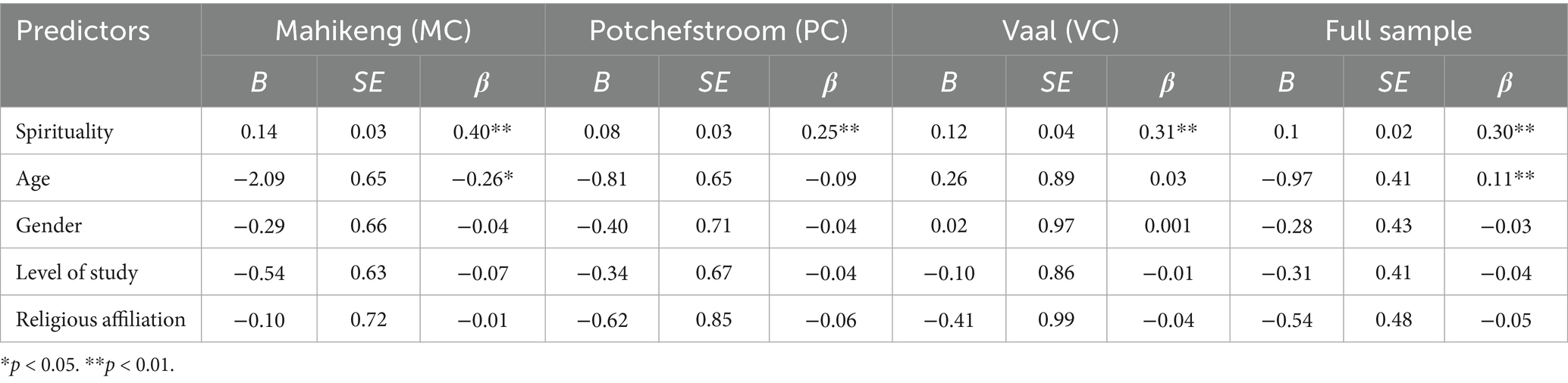 The regression analysis results for samples obtained from the three NWU campuses and for the total sample are displayed in Table 3. Outcomes show that high spirituality significantly predicts high academic perseverance across samples from the three campuses [MC (β = 0.40, p < 0.001), PC (β = 0.25, p < 0.001), VC (β = 0.31, p < 0.001)] and the whole sample (β = 0.30, p < 0.001). Of all the control variables, only age was significantly associated with academic perseverance in MC (β = −0.26, p < 0.05) and the total samples (β = −0.11, p < 0.01). Specifically, being aged 18–21 was associated with low perseverance. The model predicted 21, 6, 11 and 10% variances in academic perseverance in MC, PC, Vaal and the total sample, respectively.