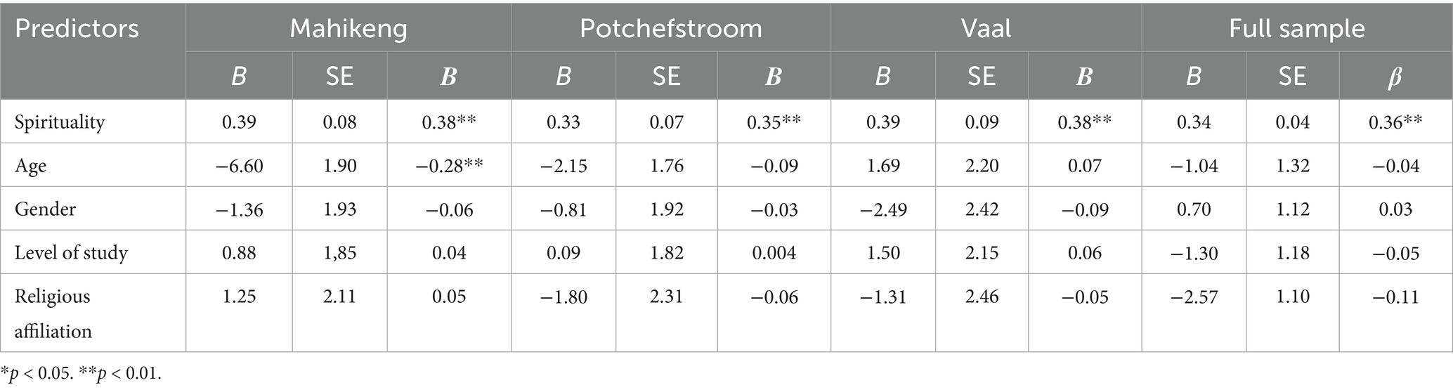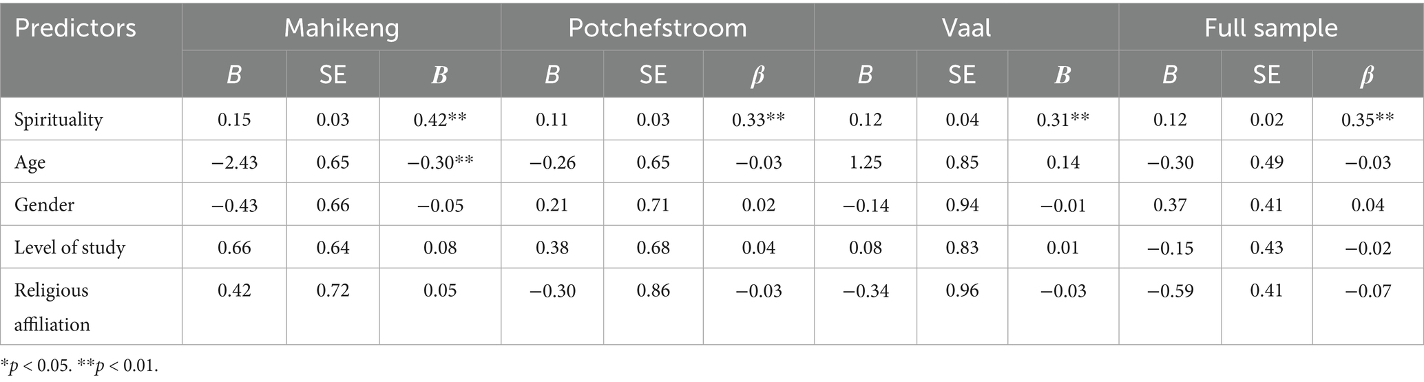 Table 6. Summary of the multiple regression analysis on the relationship between spirituality and academic resilience stratified by campus location.