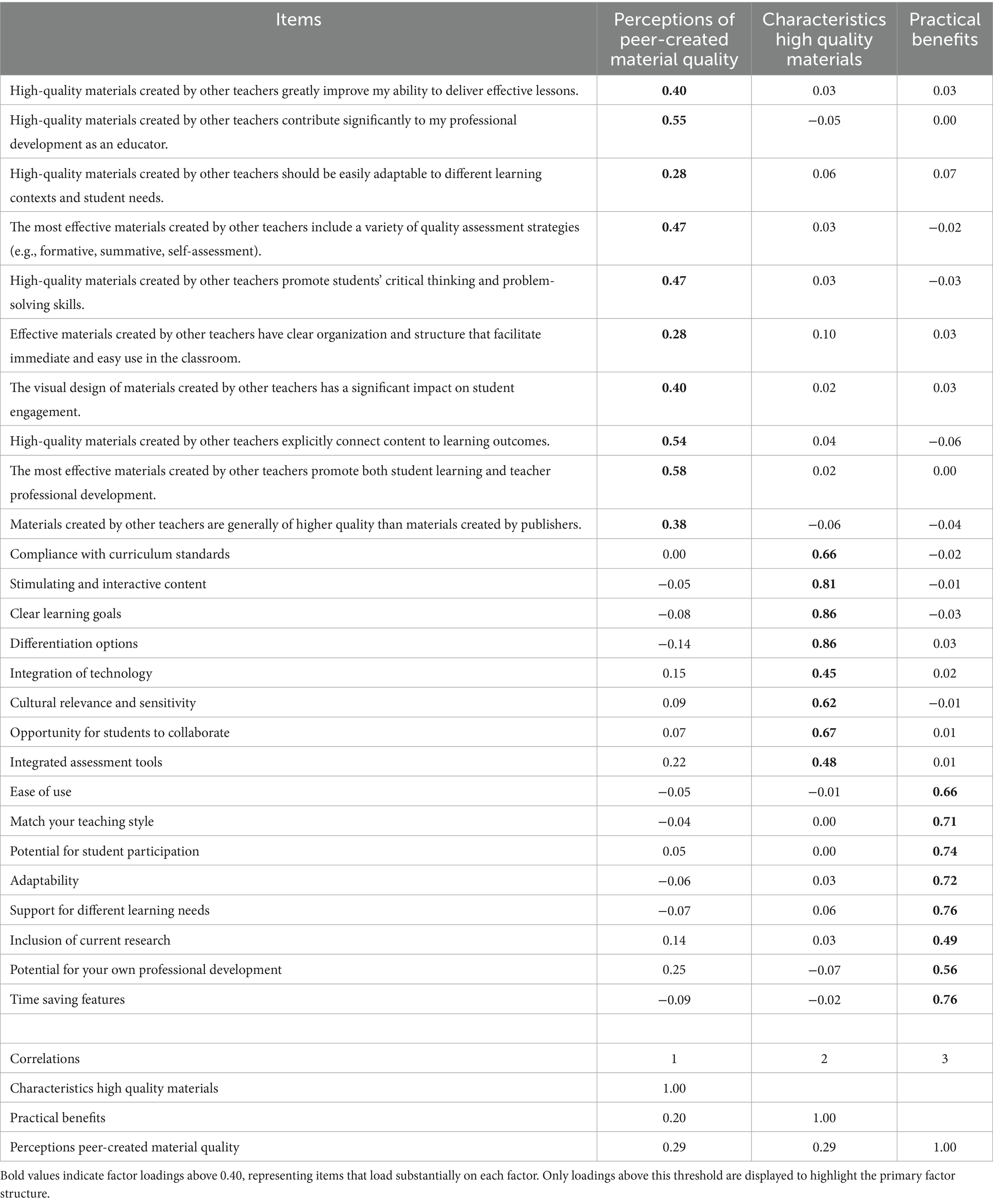 The factor analysis revealed three distinct response patterns underlying teacher perceptions of instructional material quality. These response patterns are labeled: (1) Teacher perceptions of peer-created material quality, (2) Pedagogical and structural characteristics of high-quality materials, and (3) Teacher-centric considerations and practical benefits. The full pattern matrix and inter-factor correlations are presented in Table 1.
