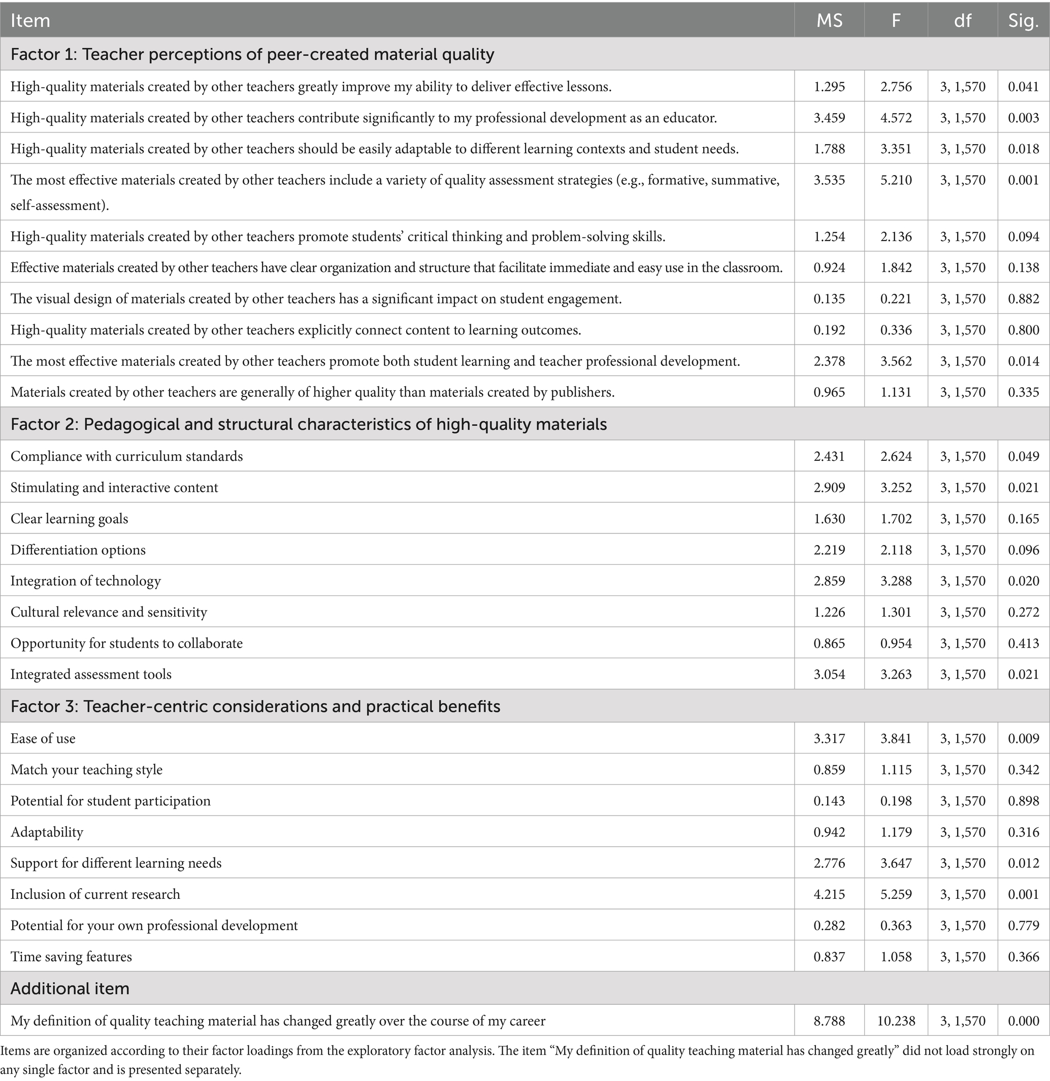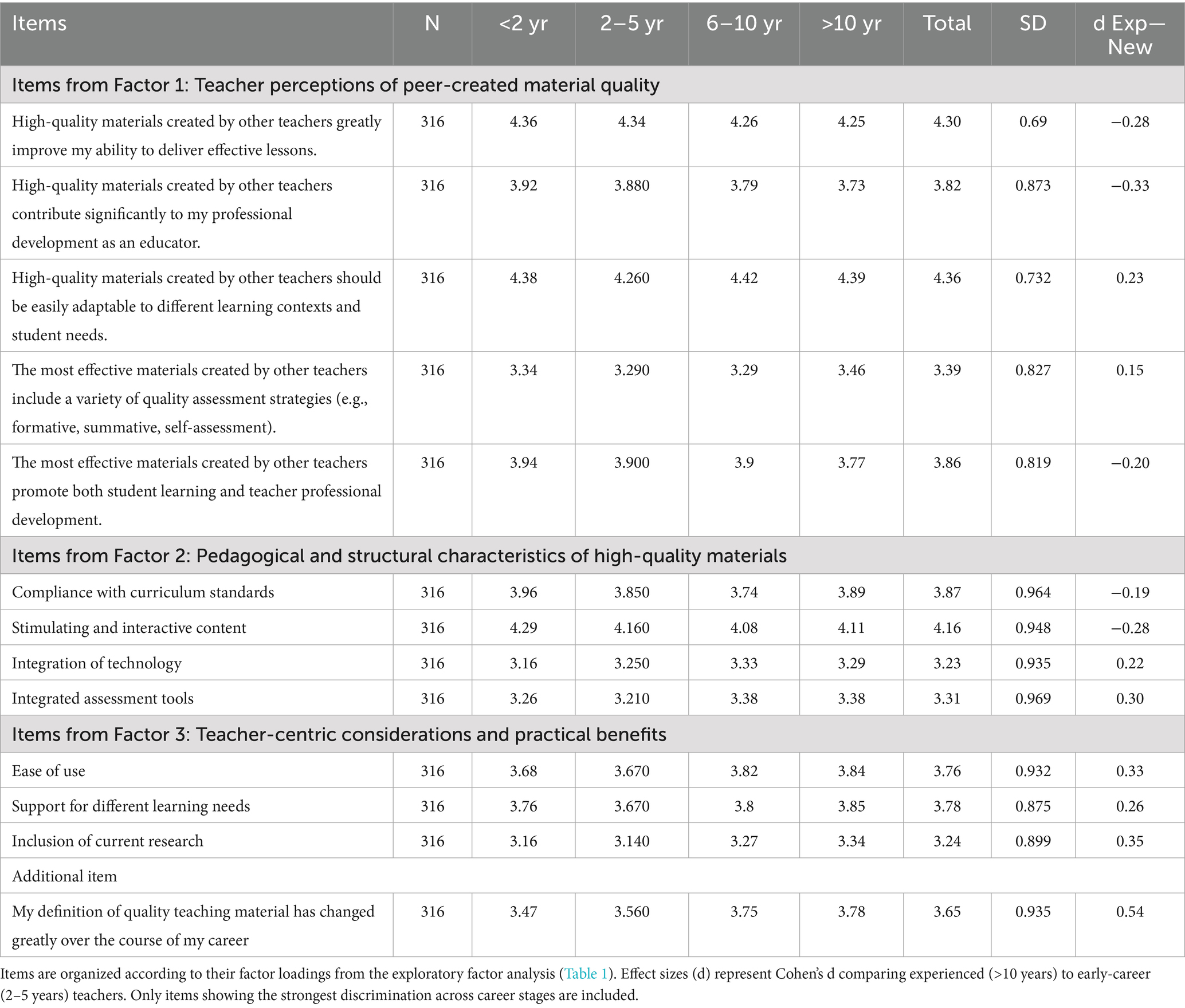 The patterns in Table 2 reveal differential emphasis across the three quality dimensions. Items loading on Factor 1 (Teacher Perceptions of Peer-Created Material Quality) showed significant variation across career stages, with early-career teachers rating peer-created materials more highly for professional development (F = 4.572, p = 0.003) and lesson delivery (F = 2.756, p = 0.041). Items loading on Factor 2 (Pedagogical and Structural Characteristics) showed mixed patterns, with early-career teachers emphasizing curriculum compliance (F = 2.624, p = 0.049) and stimulating content (F = 3.252, p = 0.021), while foundational features like clear learning goals and differentiation options did not differ significantly by career stage. Items loading on Factor 3 (Teacher-Centric Considerations and Practical Benefits) showed the strongest career-stage effects, with experienced teachers prioritizing ease of use (F = 3.841, p = 0.009), technology integration (F = 3.288, p = 0.020), support for different learning needs (F = 3.647, p = 0.012), and inclusion of current research (F = 5.259, p = 0.001).