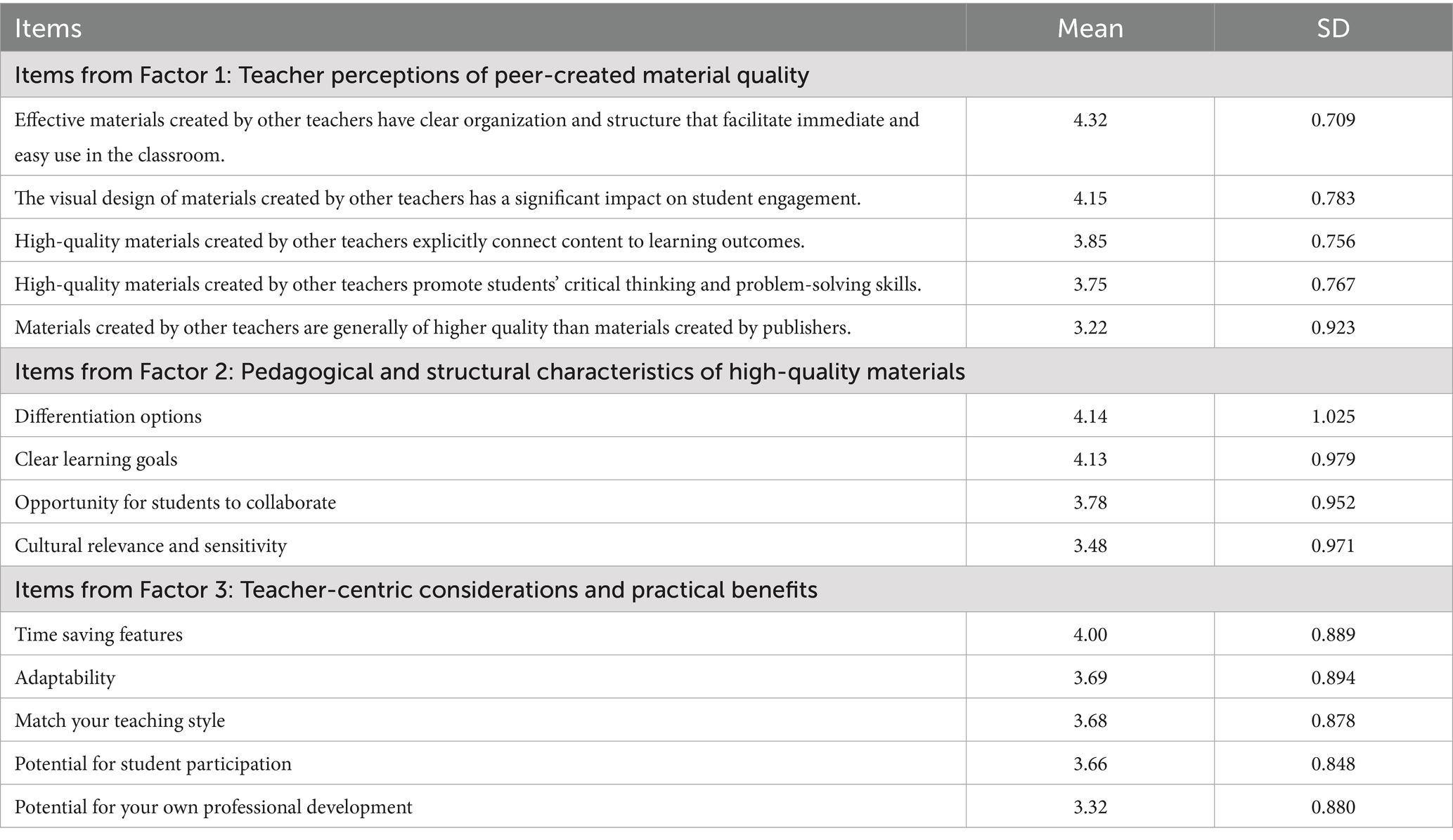 These response patterns reflect the survey structure, with Factor 1 capturing responses to items specifically about peer-created materials, Factor 2 reflecting evaluations of general pedagogical characteristics, and Factor 3 representing teacher-centric practical considerations.