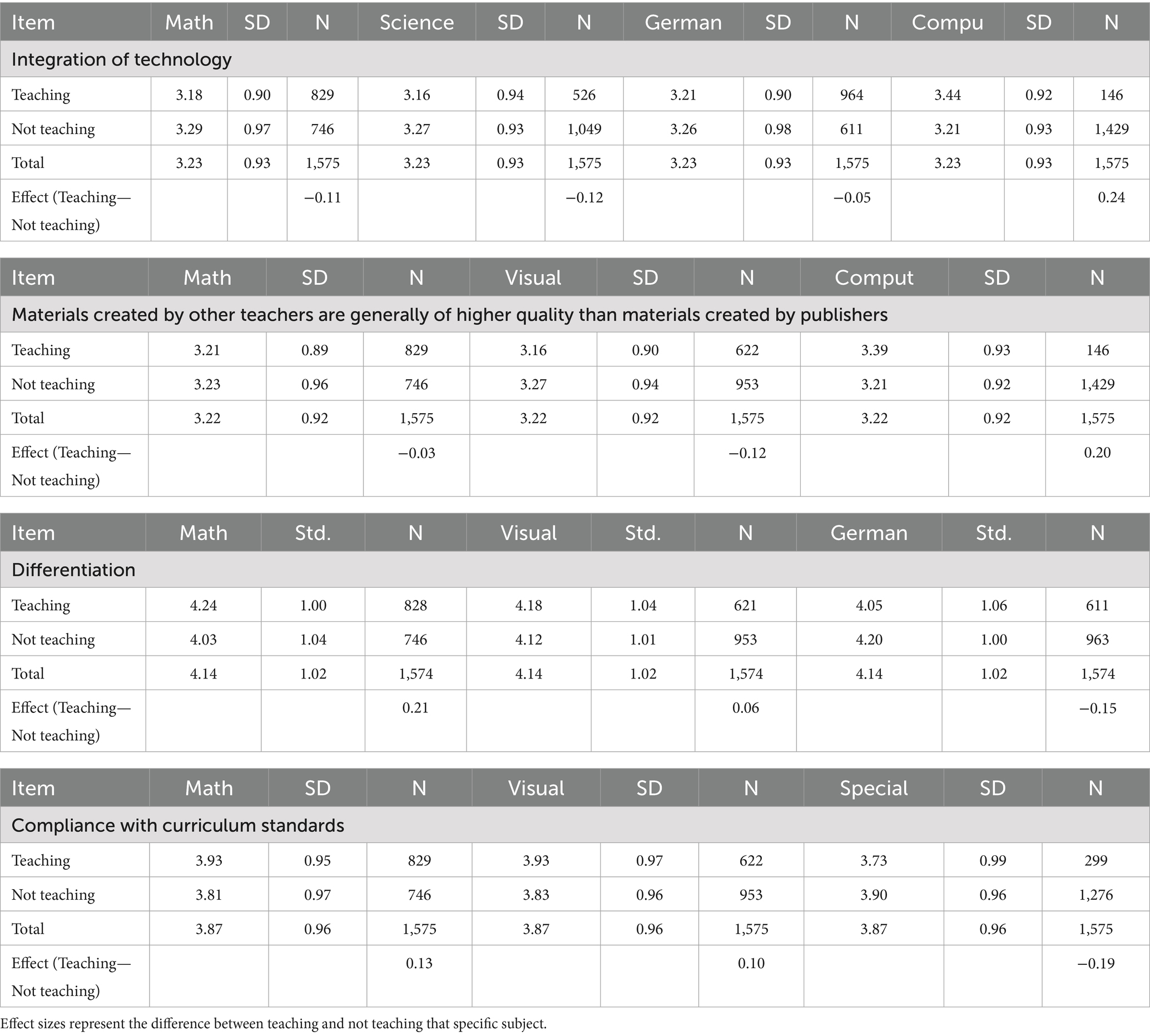 Our findings highlight that the concept of quality shifts with experience. Early-career teachers place greater emphasis on structured, ready-to-use features that reduce preparation demands, while more experienced teachers prioritize adaptability, integration of current research and assessment, support for diverse learning needs, and alignment with personal pedagogical values. Quality perceptions also vary across subject domains. Characteristics such as technology integration, differentiation, and curriculum compliance take on different importance depending on the subject, which underscores the need for tailored resources that reflect both career stage and disciplinary demands.