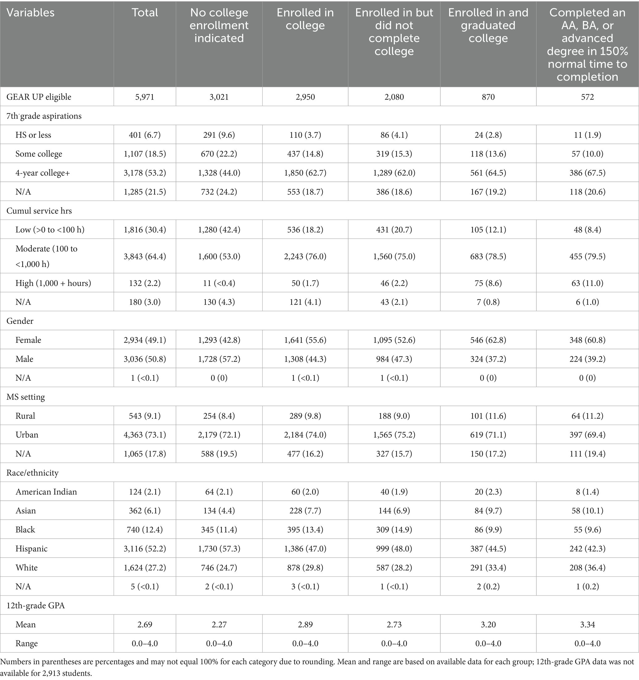 The binary logistic regression analysis included only those students for which data on all variables were available (n = 1,704). Cases that were missing data for any of the predictor variables (12th-grade GPA, 7th-grade college aspirations, cumulative GEAR UP program service hours, gender, middle school setting, and race/ethnicity), or that did not enroll in college, are not included in the binary logistic regression. Descriptive statistics for all GEAR UP Cohort 2 eligible students (n = 5,971) are provided in the following section, and descriptive statistics for only those students whose records are included in the logistic regression are presented in detail within the Binary Logistic Regression session.