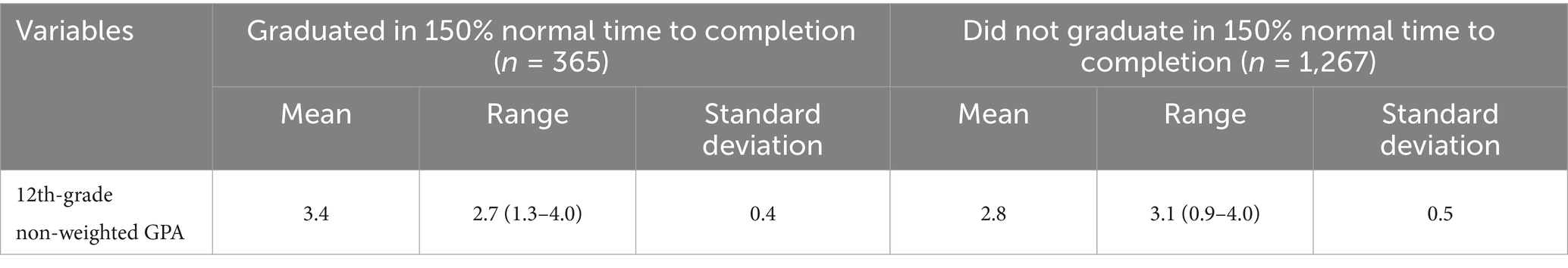 Now focusing purely on the complete cases explored for this analysis, the majority of students included in the binary logistic regression did not obtain a degree within 150% normal time to completion, with 78% of the 1,632 students who did not graduate and 22% who did graduate within the designated time to completion. For 12th-grade, non-weighted GPA, students who graduated in 150% normal time to completion had a higher mean GPA than students that did not graduate in 150% normal time to completion (Table 2). They also had a slightly lower standard deviation, indicating less variation in the spread of the data. This is also evident in the range of GPAs within each group. While both groups had a maximum GPA of 4.0, students who graduated in 150% normal time earned a higher minimum GPA value (1.3 v 0.9).