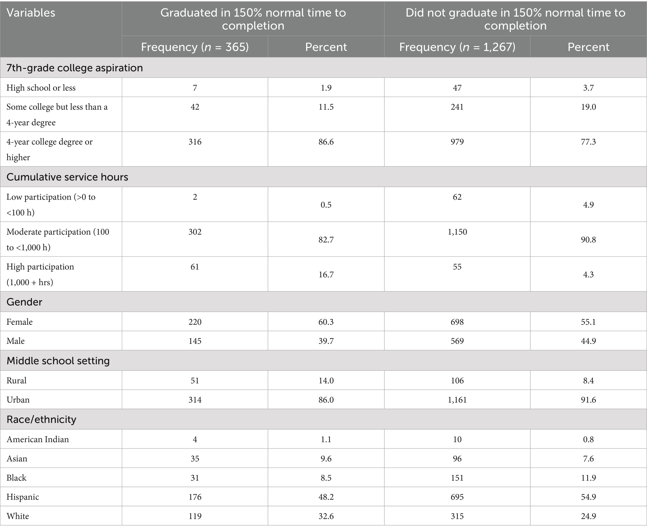 Table 3 provides frequencies of each of the categorical predictor variables, followed by a brief narrative summary for each variable. Students who graduated in 150% normal time expressed slightly higher rates of college aspiration than those who did not express aspirations to attend some college, 87% compared to 77%, respectively. A similar trend was evidenced regarding participation in the program with increased participation aligning with completion time. Females were only slightly overrepresented in the graduated in 150% normal time to completion group compared to males. Also, students who attended a rural middle school were slightly overrepresented within the completion group as compared to urban students. In examining racial/ethnic demographics. Asian and White students were slightly overrepresented in the group that completed college in 150% normal time (9.6% compared to 8% in the overall dataset, and 32.6% compared to 26.6%, respectively), while Hispanic and Black students were underrepresented within this same group (48.2% compared to 53.4% in the total dataset, and 8.5% compared to 11.2%, respectively).
