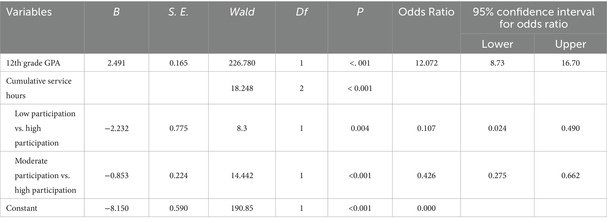 Regression results indicated that the overall model of two predictors (12th-grade GPA and cumulative service hours) was questionable (−2 Log likelihood = 1,339.36) but statistically reliable in distinguishing between completing or not completing a college degree in 150% normal time [χ2(2) = 395.431, p < 0.001], with Cox & Snell R2 = 0.215 and Nagelkerke R2 = 0.329.