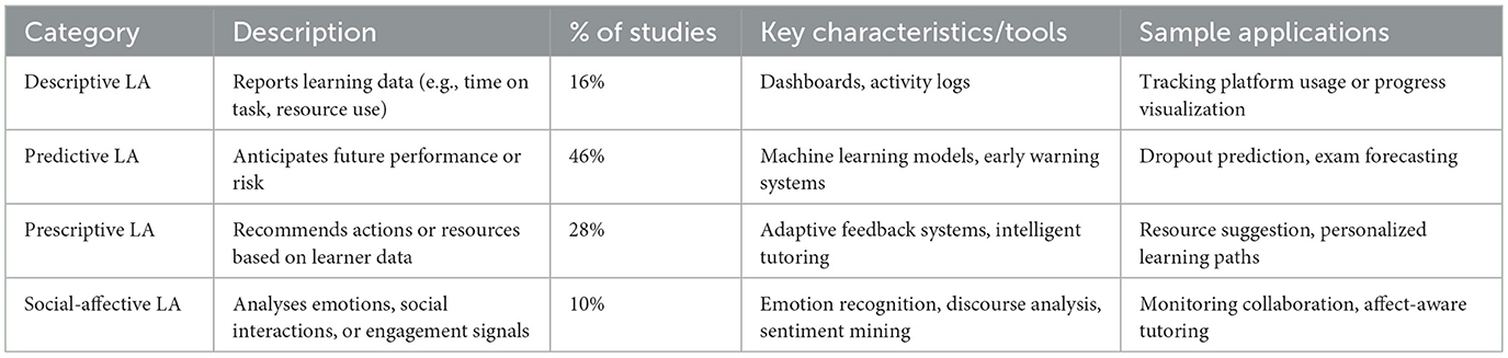 To provide a clearer overview of the analytical orientations present in the selected studies, the Table 1 summarizes the distribution, defining characteristics, and illustrative applications of the four identified Learning Analytics categories. These categories—descriptive, predictive, prescriptive, and social-affective—reflect distinct levels of data processing complexity and pedagogical intent. The table also highlights the relative prevalence of each category in the reviewed corpus and their typical implementations in educational settings. This classification serves as a foundation for the critical interpretation offered in the discussion section.