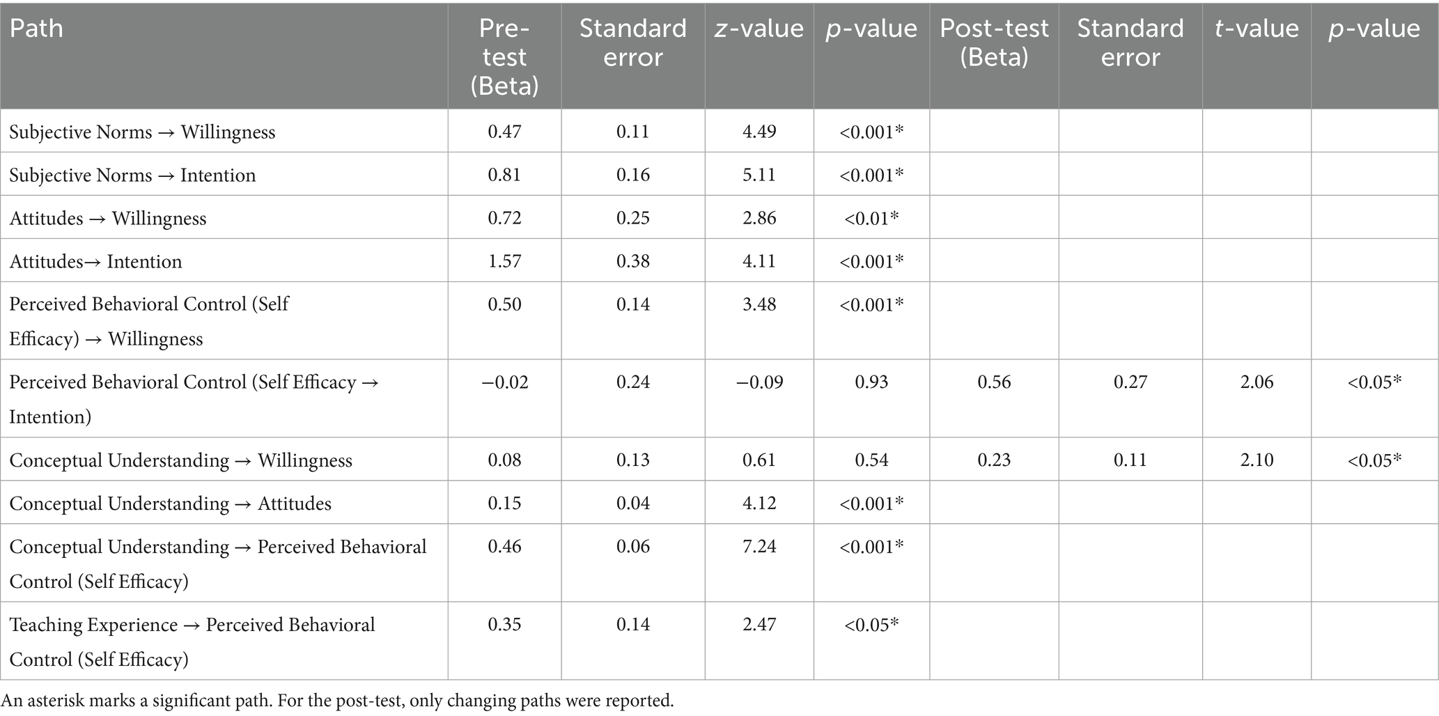To answer our research questions, we performed a multigroup path analysis according to the TPB, extended by the PSTs’ conceptual understanding and teaching experience about climate change. To analyze which paths within the model changed from pre- to post-test (i.e., before and after working through the tutorials), we varied every single path between pre- and post-test and performed chi-square-tests to determine whether they significantly differed. Following this, we found that the paths involving and the direct path from perceived behavioral control (self-efficacy) to intention, and the direct path from conceptual understanding to willingness varied over time since this model showed the best model fit (p < 0.01). The final model (Figure 2) showed a good model fit (RMSEA = 0.06; SRMR = 0.07, CFI = 0.984, TLI = 0.968). Table 10 shows a summary of the model.