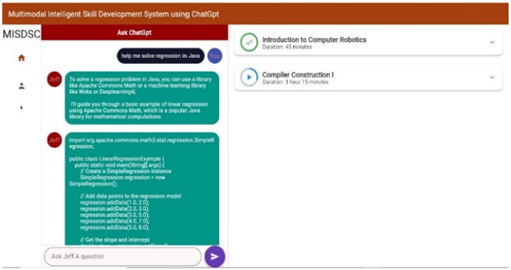 To enable intelligent interaction, OpenAI’s API was integrated as the conversational agent responsible for real-time problem-solving assistance. This feature allowed students to query ChatGPT for explanations, coding guidance, and debugging support, simulating an on-demand virtual tutor.