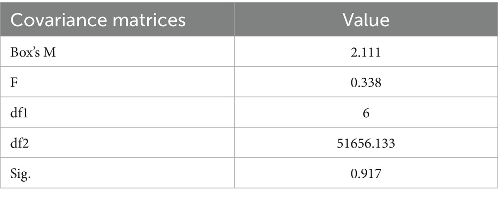 Before proceeding with the main analysis, we conducted a series of preliminary checks to ensure that the assumptions underpinning Multivariate Analysis of Covariance (MANCOVA) were met. These diagnostic tests were essential for validating the integrity and robustness of our findings regarding the effect of instructional method on student outcomes. First, we assessed the normality of our dependent variables such as engagement, intrinsic motivation, and academic achievement by examining skewness and kurtosis values. The distribution of each variable approximated normality, with skewness and kurtosis values falling within the acceptable ±2 range (Byrne, 2010; Hair et al., 2010). This gave us confidence that the assumption of univariate normality was satisfied. We also examined the linearity of relationships between our covariate prior programming experience and each dependent variable. Scatterplots revealed that the relationships were reasonably linear, indicating that the linearity assumption for MANCOVA was met. Next, we tested the homogeneity of variance–covariance matrices using Box’s M test. Table 1 yielded a non-significant result, Box’s M = 2.11, F(6, 51656.13) = 0.338, p = 0.917, confirming that the covariance matrices for the dependent variables were equal across the instructional groups. This indicated that the multivariate homogeneity of variance–covariance assumption was upheld.