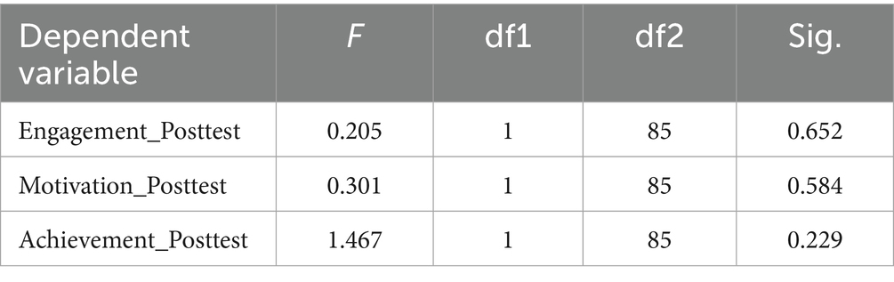 To determine whether the assumption of homogeneity of regression slopes held, we assessed the interaction between instructional method and the covariate (prior programming experience) for each dependent variable. The non-significant interaction effects suggested that the regression slopes were homogeneous across groups, satisfying this critical assumption. We further examined Levene’s Test of Equality of Error Variances to assess the homoscedasticity of each dependent variable. Table 2 revealed that engagement, motivation, and achievement produced non-significant Levene’s test results (p > 0.05), confirming that the assumption of equal variances was not violated. Finally, we evaluated multicollinearity by inspecting the intercorrelations among the dependent variables. The correlations ranged from moderate to strong but did not exceed problematic thresholds of 0.85. This assured us that the dependent variables shared some variance while still retaining distinct constructs, justifying their inclusion in a multivariate analysis. Taken together, the results of these preliminary tests provided us with a sound basis to proceed with the MANCOVA as all assumptions were sufficiently met.