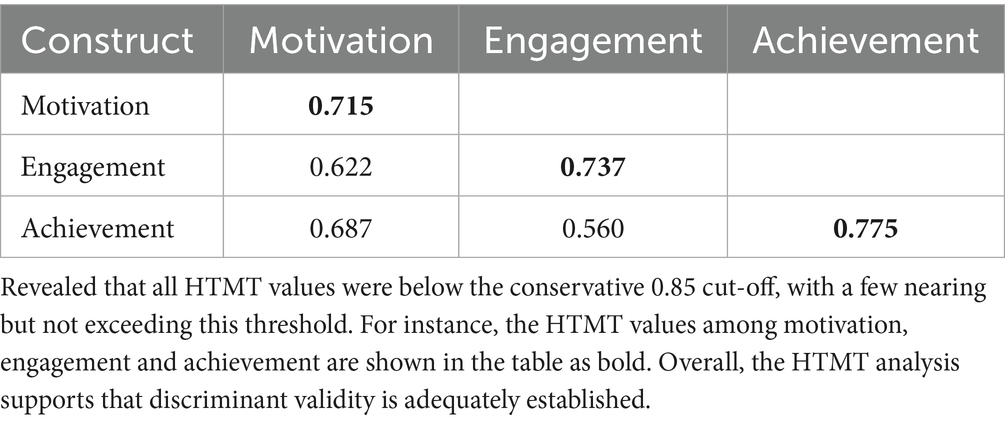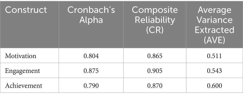 Also, we evaluated the reliability and validity of our measurement instruments for engagement, motivation, and achievement in the context of AI-supported problem-based. Table 3 indicated that all constructs demonstrated strong internal consistency, exceeding the recommended threshold of 0.70 (Hair et al., 2010). Composite reliability (CR) values also supported this, ranging from 0.865 to 0.905, confirming that the constructs consistently captured their respective latent variables. Furthermore, all constructs demonstrated adequate convergent validity, as the average variance extracted (AVE) values exceeded the 0.50 benchmark suggesting that more than 50% of the variance in observed variables was explained by their underlying constructs (Fornell and Larcker, 1981).