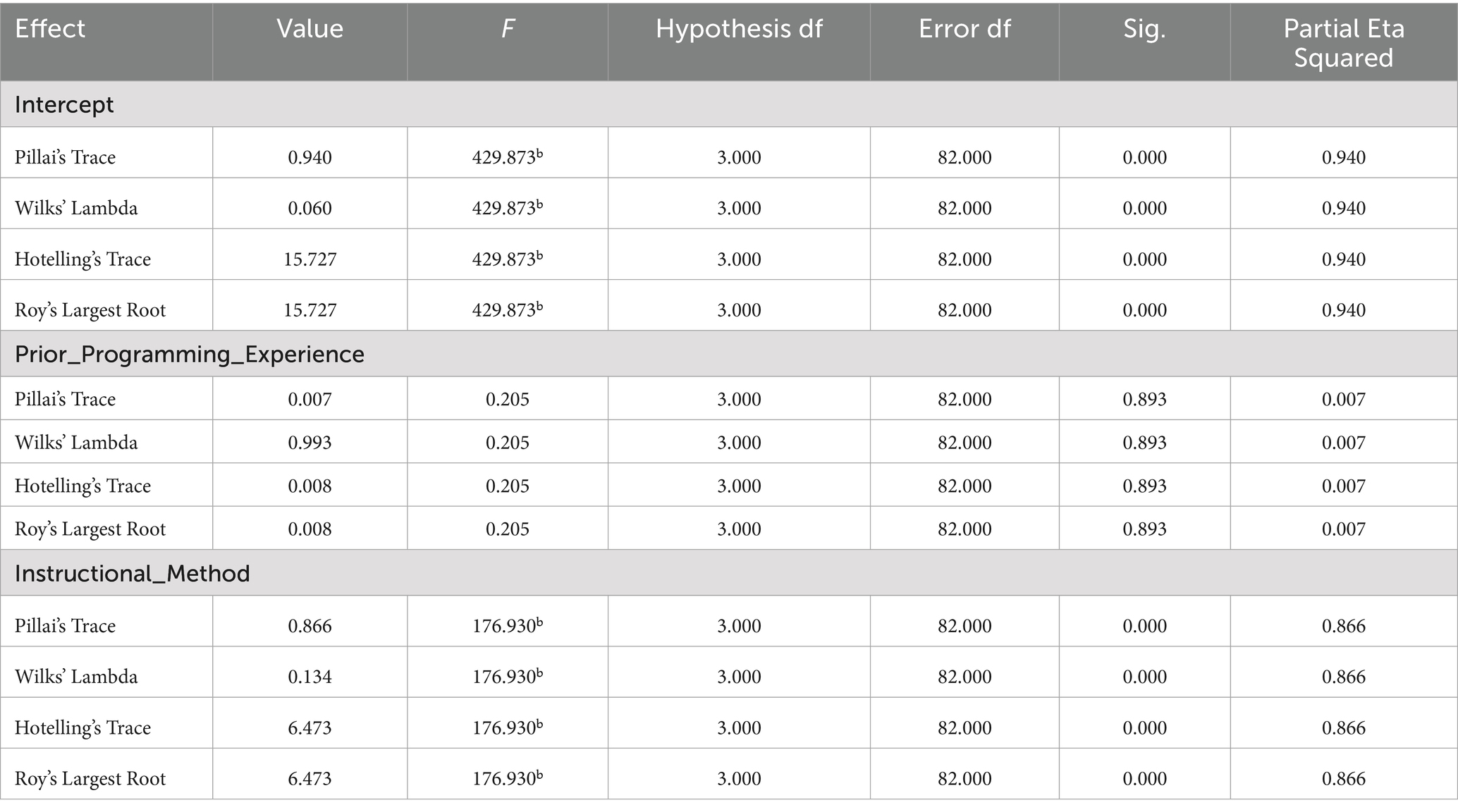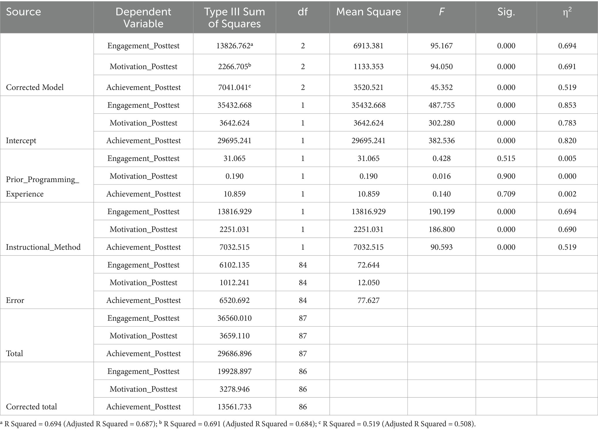 To address our research hypotheses, we conducted a one-way Multivariate Analysis of Covariance (MANCOVA), which allowed us to assess the combined and individual effects of the instructional method on the three outcome variables, while adjusting for the covariate. The multivariate results revealed a statistically significant effect of instructional method on the combined dependent variables. As shown in Table 5, Wilks’ Lambda was 0.134, F(3, 82) = 176.93, p < 0.001, with a partial eta squared (η2) of 0.866. This indicates that the instructional method accounted for approximately 86.6% of the variance in the combination of engagement, intrinsic motivation, and achievement. Based on this strong effect size, we rejected the main null hypothesis and concluded that the mode of instruction had a significant joint effect on students’ learning outcomes. Conversely, Table 5 shows that prior programming experience did not yield a statistically significant multivariate effect, Wilks’ Lambda = 0.993, F(3, 82) = 0.205, p = 0.893, η2 = 0.007. This suggests that students’ previous exposure to programming did not substantially affect the combined outcome measures, reinforcing the dominant role of instructional method.