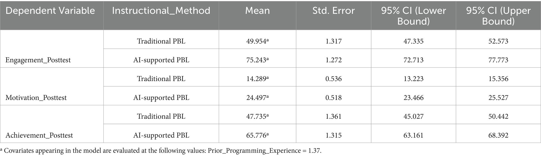 To further reinforce these results, our estimated marginal means revealed that students in the AI-supported PBL condition scored higher across all outcomes. Specifically, they scored an average of 75.24 on engagement compared to 49.95 in the traditional PBL group; 24.50 on intrinsic motivation compared to 14.29; and 65.78 on academic achievement compared to 47.74 (see Table 7). These mean differences, adjusted for prior programming experience, affirm the positive effect of integrating AI tools into PBL pedagogy.