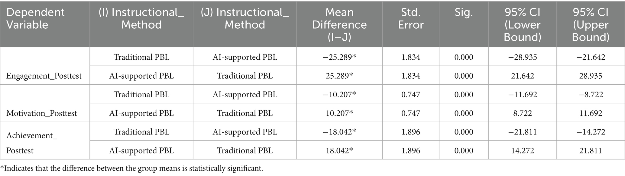 Assessing individual outcomes through the between-subjects effects, we found that instructional method had a statistically significant effect on each dependent variable. For engagement, Table 6 showed F(1, 84) = 190.20, p < 0.001, η2 = 0.694, indicating that students in the AI-supported PBL group were significantly more engaged than those taught through traditional PBL. In terms of intrinsic motivation, the result was also significant, F(1, 84) = 186.80, p < 0.001, η2 = 0.690, confirming that students exposed to the AI-supported instructional method reported notably higher levels of motivation. For academic achievement, a significant effect was observed as well, F(1, 84) = 90.59, p < 0.001, η2 = 0.519, highlighting the advantage of AI-supported PBL in enhancing students’ academic performance. These results support our hypotheses (H1–H3) and demonstrate that the instructional method had a strong and consistent effect across all three learning outcomes.