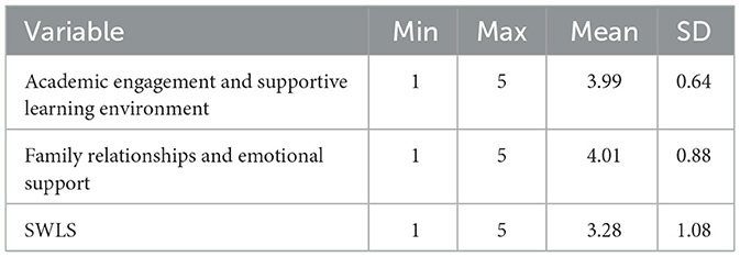 Life satisfaction was assessed using the Satisfaction With Life Scale (Diener, 1984), a widely validated instrument designed to measure the cognitive-evaluative component of subjective wellbeing. The scale consists of five statements (e.g., “In most ways my life is close to my ideal”), with responses rated on a 5-point Likert scale ranging from 1 (strongly disagree) to 5 (strongly agree). This instrument has been extensively used in higher education research and has demonstrated cross-cultural validity (Pavot and Diener, 2008; Diener et al., 2013; Schnettler et al., 2021). In the current sample, the SWLS showed excellent internal consistency, with a Cronbach's alpha of.91, indicating a high degree of reliability in capturing students' global life satisfaction.
