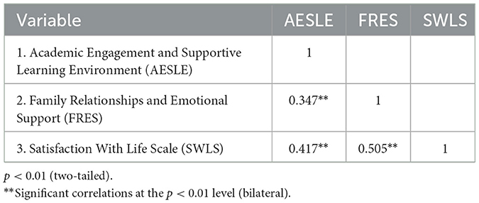 Table 1 shows descriptive statistics. On average, students reported moderately high family support (M ≈ 4.01 of 5, SD ≈ 0.88) and learning environment quality/engagement (AESLE M ≈ 3.99, SD ≈ 0.64), whereas life satisfaction was somewhat lower (SWLS M ≈ 3.28, SD ≈ 1.08). The SWLS scores also showed the greatest variability (CV ≈ 33%), indicating diverse levels of life satisfaction among students. All three variables were significantly intercorrelated (p < 0.001): Family support correlated moderately with AESLE (r ≈ 0.35) and with life satisfaction (r ≈ 0.51), and AESLE was positively correlated with life satisfaction (r ≈ 0.42). As shown in Table 2, better family relationships co-occurred with perceiving a more supportive academic environment and with greater life satisfaction.