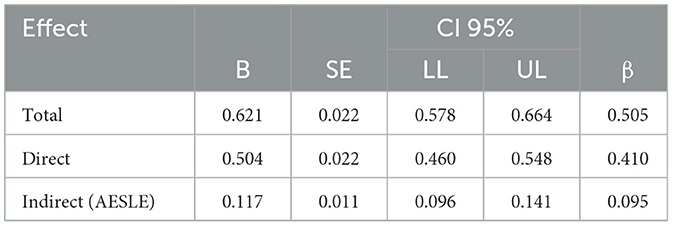 Mediation analyses supported our hypothesized model. Family Relationships and Emotional Support (FRES) significantly predicted Academic Engagement and Supportive Learning Environment (AESLE) (path a: B = 0.251, SE = 0.014, t = 17.86, p < 0.001), explaining 12% of the variance (R2 = 0.120). When predicting life satisfaction (SWLS), both FRES and AESLE were significant predictors: FRES → SWLS (direct effect, c′): B = 0.504, SE = 0.022, p < 0.001; AESLE → SWLS: B = 0.468, SE = 0.031, p < 0.001. The model accounted for 32.2% of the variance in SWLS (R2 = 0.322). The total effect of FRES on SWLS (c path) was B = 0.621 (p < 0.001), and the inclusion of AESLE in the model reduced the direct effect to B = 0.504, indicating partial mediation. The bootstrapped indirect effect (FRES → AESLE → SWLS) was statistically significant: B = 0.117, SE = 0.011, 95% CI [0.095, 0.140], with a completely standardized indirect effect of β = 0.095, SE = 0.009, 95% CI [0.078, 0.113]. As presented in Table 3, both the direct and indirect effects of family relationships on life satisfaction were significant, confirming a partial mediation model. Since the confidence intervals did not include zero, this supports a significant partial mediation effect, where family support influences life satisfaction both directly and indirectly through students' engagement and perception of their academic environment.