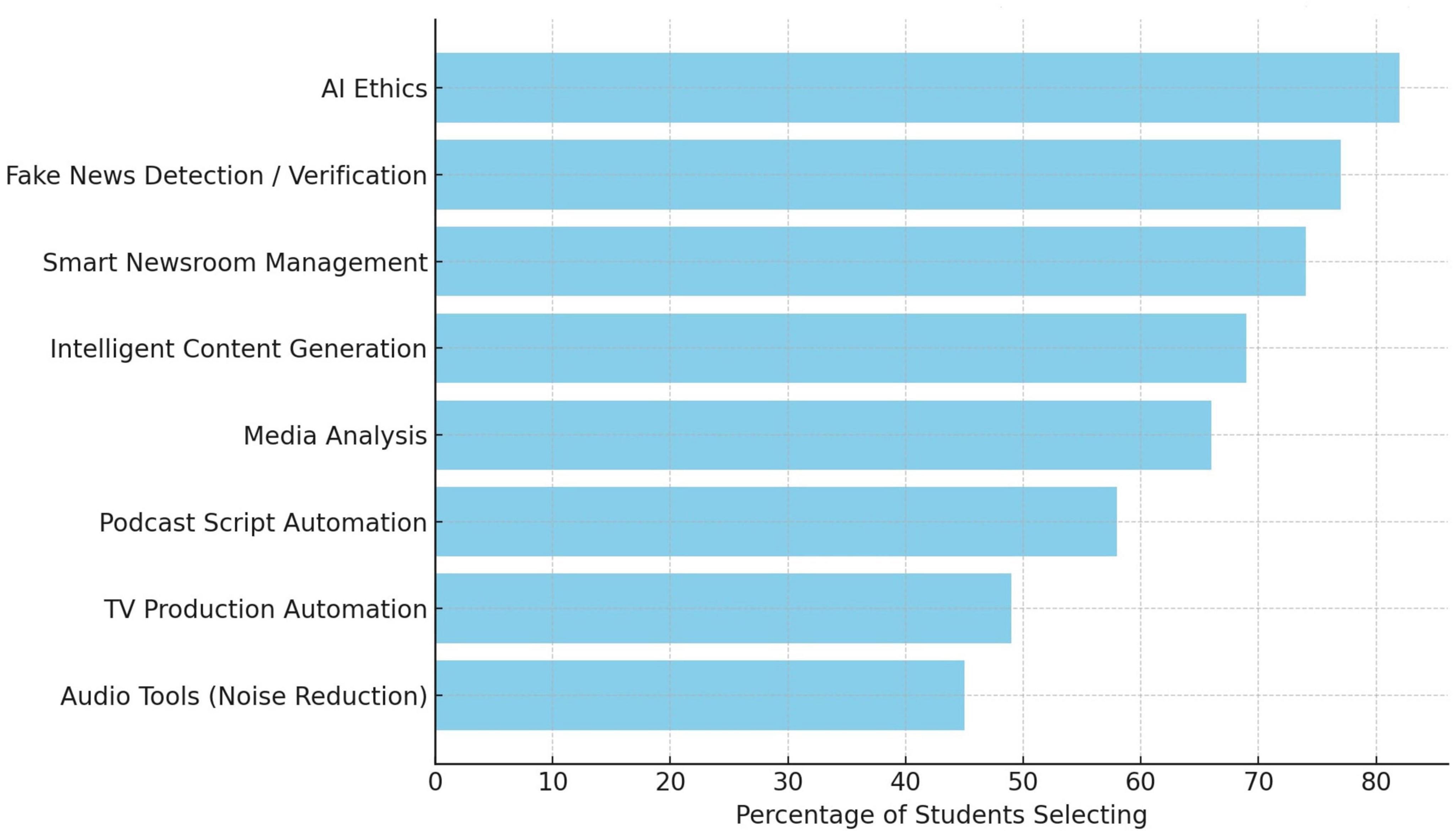 Figure 2. Percentage of students endorsing each AI integration domain (multiple responses allowed). AI ethics, fake news detection, and smart newsroom management were most frequently selected.