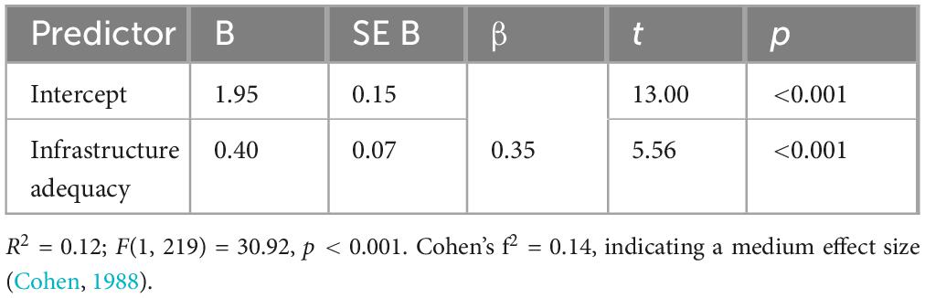 A simple linear regression was used to evaluate if students’ views of the sufficiency of the infrastructure could significantly forecast their views of the faculty readiness to integrate AI into journalism curricula.