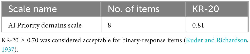 In order to evaluate the internal reliability of the eight binary items, Kuder–Richardson Formula 20 (KR-20) was utilized in place of Cronbach’s α (which is for continuous data). The scale showed reasonable internal consistency: Internal reliability results for the domain checklist are reported in Table 4.