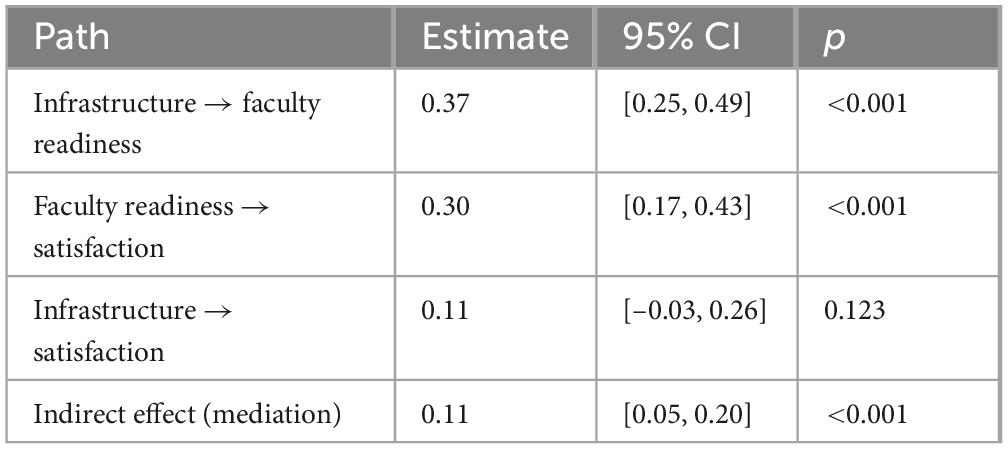 The straightway from infrastructure to satisfaction did not show a significant effect (p = 0.123), however, the indirect effect through faculty readiness was significant and moderate in size (β = 0.11, 95% CI [0.05, 0.20]). The arrangement of the data is in agreement with a model of full mediation, which implies that infrastructure by itself is not a predictor of satisfaction if not along with the perception of instructional preparedness. Path estimates and mediation results are presented in Table 5.