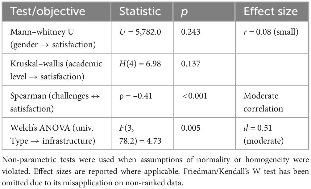 A Welch’s ANOVA was utilized to evaluate whether students’ perceptions of infrastructure adequacy vary across different types of institutions. This method was chosen because of the unequal group sizes and the significant difference in variances across the groups as confirmed by Levene’s test (p = 0.041). The test pointed to a statistically significant influence of the type of university on infrastructure adequacy: F(3, 78.2) = 4.73, p = 0.005. The Games–Howell post hoc comparisons indicated that students of non-profit universities reported significantly lower infrastructure adequacy than those of public universities (p = 0.004). The corresponding Cohen’s d = 0.51, which indicates a moderate effect size (Cohen, 1988).