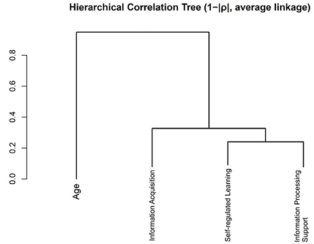 As a complementary and descriptive analysis, a hierarchical correlation tree was constructed from the Spearman's rho (ρ) matrix of Age, Information Acquisition, Support for Processing, and Self-Regulated Learning. Distance was defined as d = 1 – |ρ| and clustering was performed using average linkage (UPGMA). Additionally, a regression decision tree (CART) was implemented (method = “anova”), with cross-validation (xval = 10) and complexity control (initial cp = 0.001; minsplit = 20). The final tree was pruned by applying the 1-SE rule on the complexity table, in order to reduce the risk of overfitting.