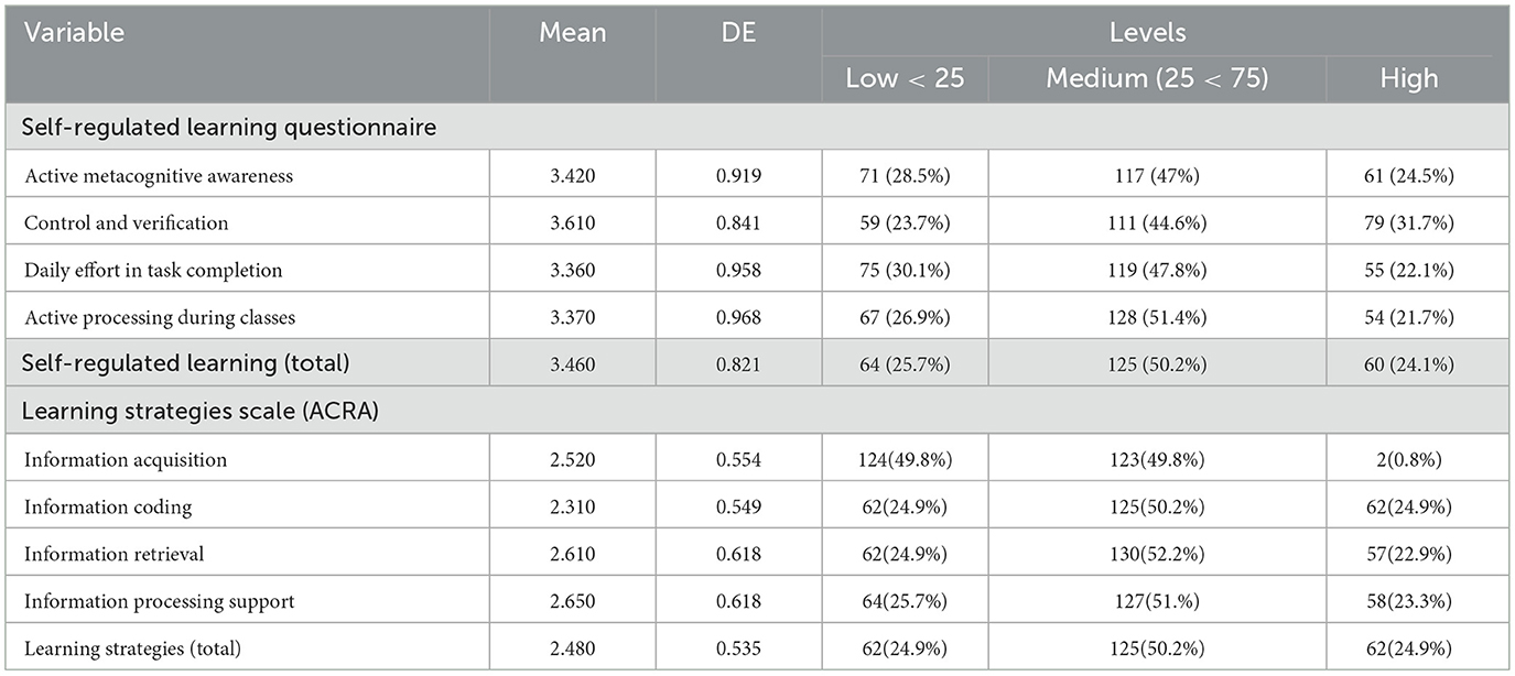 Table 2. Descriptive statistics and level distribution in the dimensions of self-regulated learning and learning strategies (ACRA).