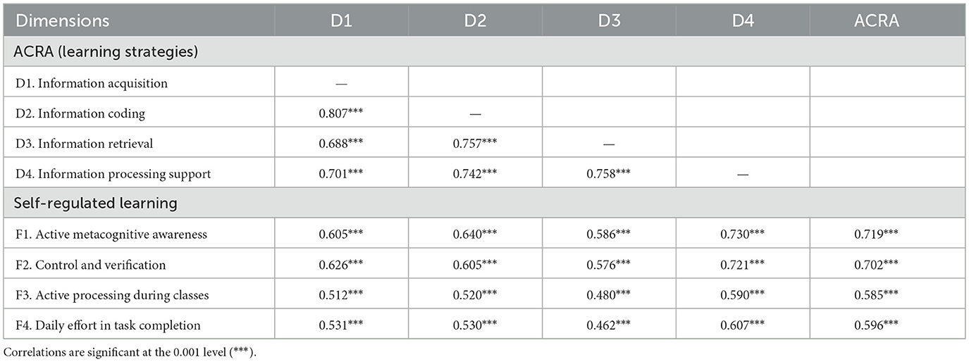 Accordingly, in Table 4, “Correlation between dimensions,” it can be observed that the Information Encoding strategy is positively and strongly correlated with Active Metacognitive Awareness (ρ = 0.64, p < 0.001); the Information Retrieval strategy shows a positive and moderate correlation with Control and Verification (ρ = 0.576, p < 0.001); the Support for Information Processing strategy is positively and strongly correlated with Daily Effort in Task Performance (ρ = 0.607, p < 0.001); and the Information Acquisition strategy is positively and moderately associated with Active Processing during Classes (ρ = 0.512, p < 0.001). It is worth noting that the lack of data normality did not affect the correlation coefficients.