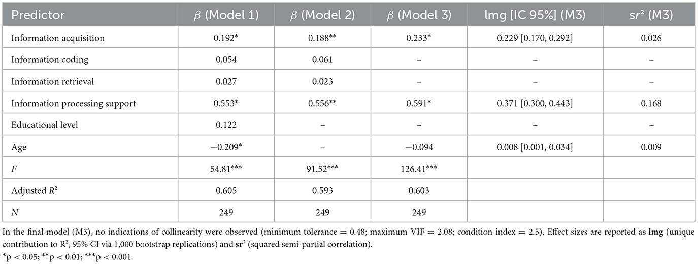 Collinearity diagnostics indicated no relevant issues (tolerances ≥ 0.48; VIF ≤ 2.08; condition index = 2.5). Regarding effect sizes, the lmg analysis with 95% CI showed that Support to Information Processing contributed the largest proportion to the total R2 (0.371 [0.300, 0.443]), followed by Information Acquisition (0.229 [0.170, 0.292]) and Age (0.008 [0.001, 0.034]). The squared semi-partial correlation values (sr2) were consistent with this pattern (0.168, 0.026, and 0.009, respectively), confirming that Support to Information Processing is the most relevant predictor.