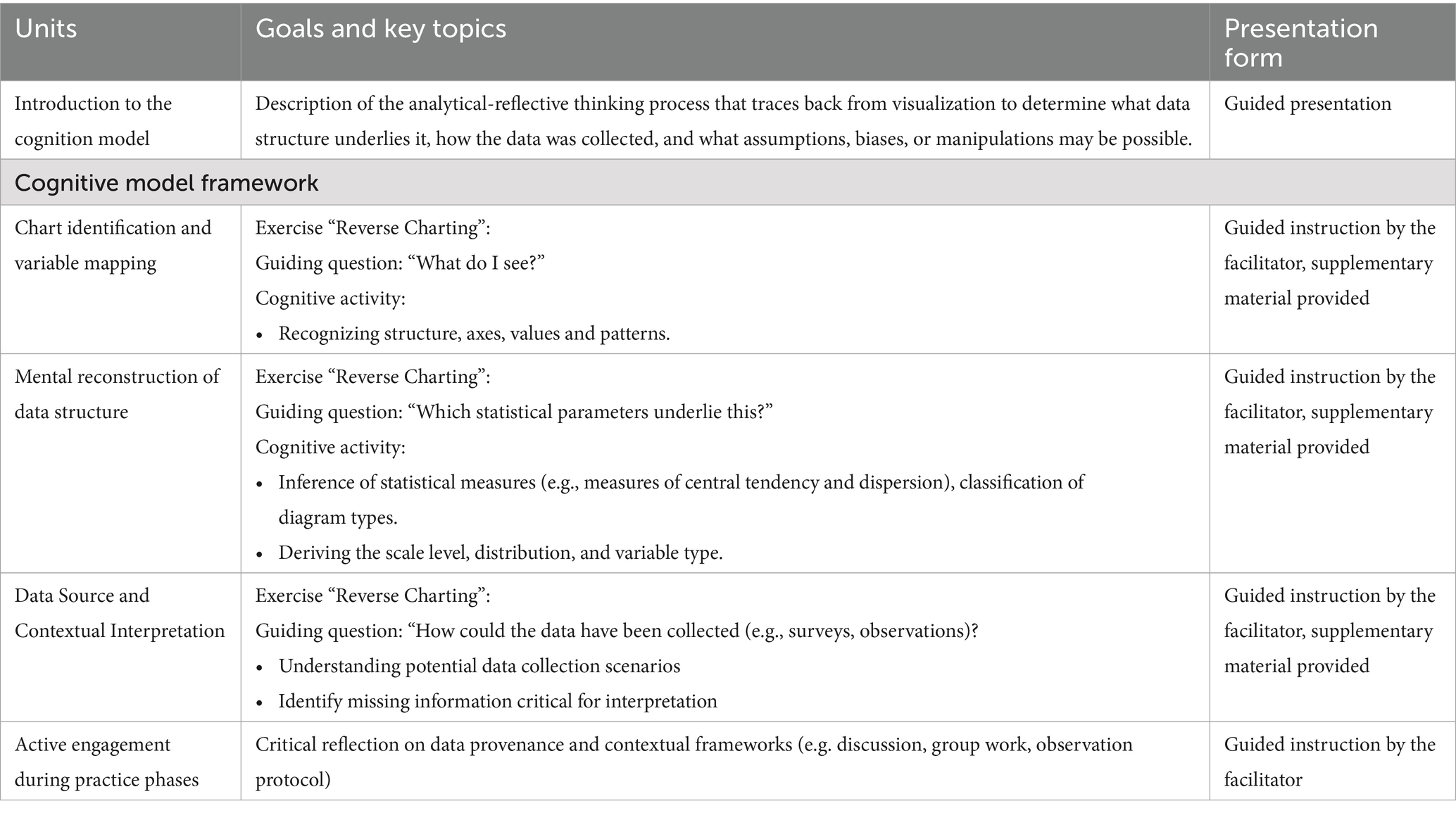 This study addresses that gap by introducing and testing a cognitive model designed to support learners in the critical evaluation of data visualizations. The model builds on a backward-oriented reasoning process, guiding students from surface-level analysis through mental reconstruction of the underlying data structure to reflection on the data collection process and its context. Despite increasing recognition of the importance of data and visual literacy, no empirically grounded instructional intervention has yet been developed that explicitly operationalizes a cognitive model for the critical evaluation of data visualizations. Existing studies have either focused on descriptive skills, on design principles for creating visualizations, or on general literacy frameworks without addressing the specific cognitive processes needed for critical interpretation (Schüller et al., 2019; Zelazny, 2015; Few, 2009; Shneiderman, 2004). To our knowledge, this is the first study that systematically develops, implements, and tests a cognitive model that guides learners through a backward-oriented reasoning process to critically assess visualized data. By doing so, it makes a unique contribution to both theory and practice: it bridges established cognitive models of information processing (Schnotz and Bannert, 2003; Mayer, 2001) with the field of data literacy education and offers an empirically tested instructional approach that can be integrated into higher education curricula. In doing so, it responds to calls for more systematic data literacy interventions while extending existing theoretical approaches. Unlike prior work that mainly provides guidelines for visualization design (Zelazny, 2015; Few, 2009; Shneiderman, 2004), the present model combines cognitive theory (Schnotz and Bannert, 2003; Mayer, 2001) with an instructional intervention that actively trains critical and reflective thinking. The goal is not only to improve formal reading skills but also to strengthen learners’ capacity for critical engagement with data as a foundation for informed communication and decision-making.