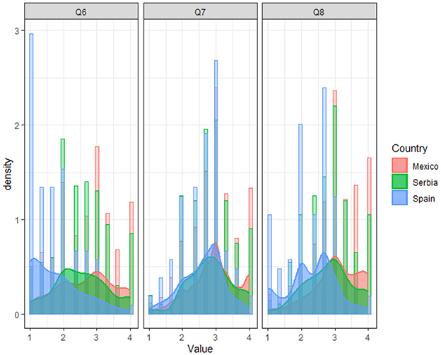 Finally, the dimension of AI adoption in higher education, which assesses the overall perception of the positive impact of these technologies, shows positive trends in Mexico and Serbia, with a higher density in high values (3 and 4). This finding suggests that students recognize the potential of AI to improve learning, increase student engagement, and foster pedagogical innovation. However, Spain shows a slight tendency toward lower values (1 and 2), which could reflect a less favorable perception in certain contexts.