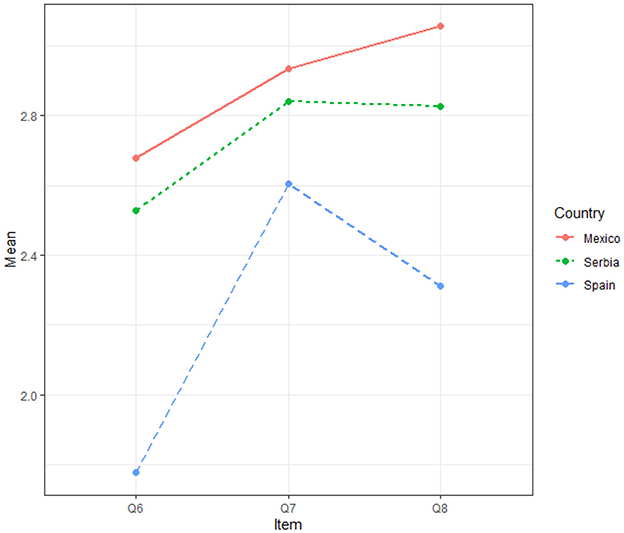 The patterns observed in Figure 2 reflect significant differences in the perception and adoption of AI between Spain, Mexico, and Serbia. In Spain, the variation in the means highlights a possible challenge in the consistent integration of AI, which could be related to contextual barriers or the lack of sustained strategies to promote its use. In Mexico, the steady increase suggests that students are developing a more positive perception, likely driven by growing familiarity with these tools or favorable institutional policies. In Serbia, the stability of the means indicates a homogeneous but moderate perception, which could signal limited use or less emphasis on AI implementation in the educational environment.
