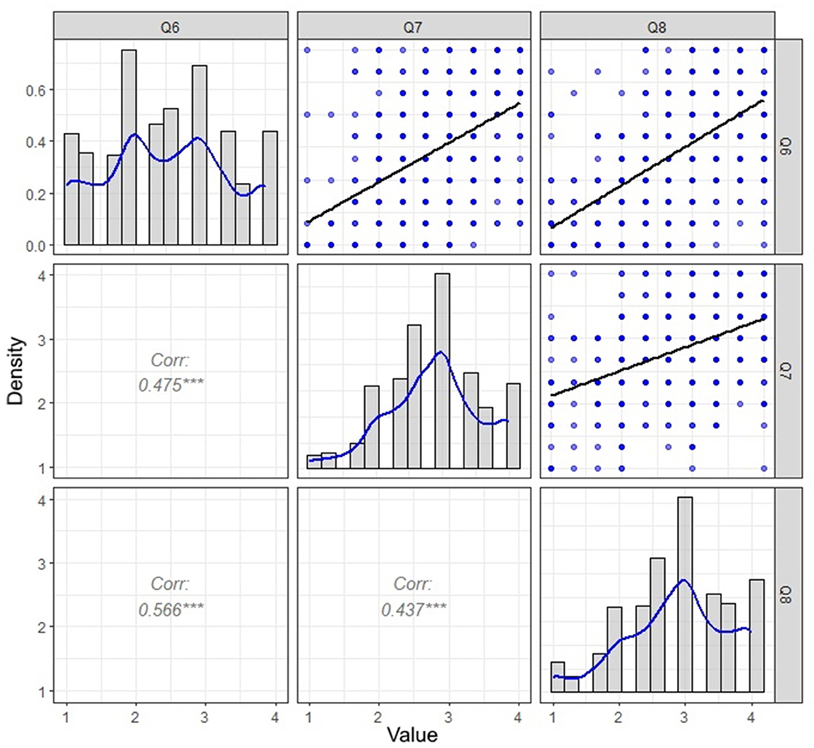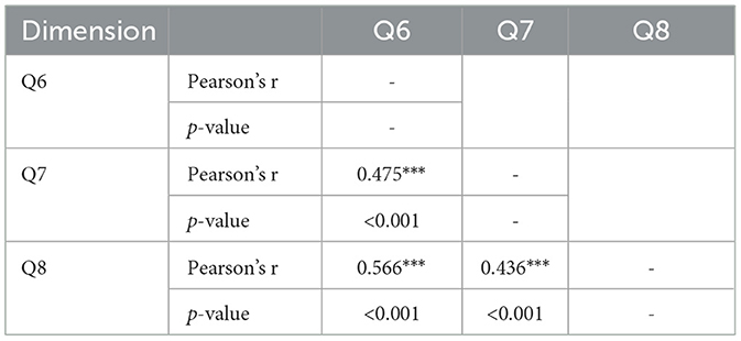 The correlational analysis in Table 3 reveals significant relationships between the dimensions evaluated (Q6, Q7, and Q8). The strongest correlation is observed between Q6 and Q8, with a value of r = 0.566 (p < 0.001). This indicates that students who integrate AI into their academic routines tend to perceive it as a tool with an overall positive impact on their educational experience.