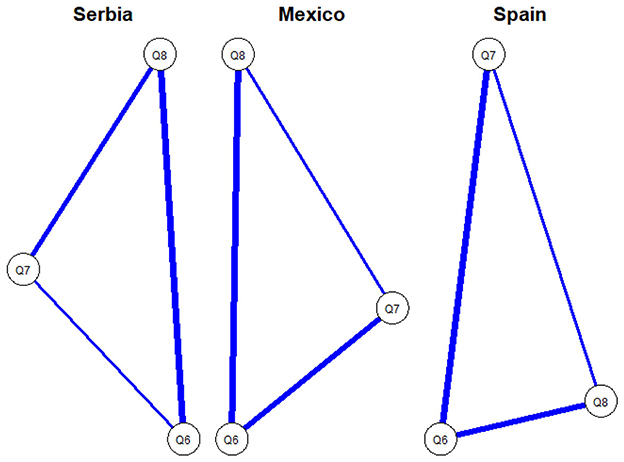 As a complementary part of the study, a network analysis was performed to explore the strength and structure of the relationships between the dimensions in the participating countries. Figure 4 shows the networks generated for Serbia, Mexico, and Spain, where the thickness of the edges represents the magnitude of the correlation between dimensions, and the color of the edges reflects the type of relationship: blue for positive relationships and red for negative ones. In all cases, a fully connected network with three nodes and three edges is observed, implying maximum density within the reduced model, with no negative links present.