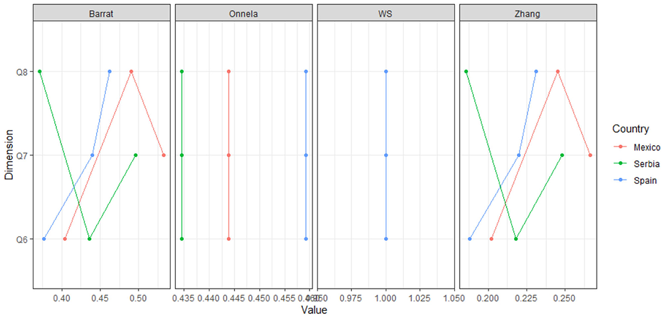 The results are complemented by an analysis using the Barrat, Onnela, WS, and Zhang clustering metrics, which allow for the evaluation of the cohesion of the variables in specific national contexts, represented in Figure 6 of clustering by question and country.